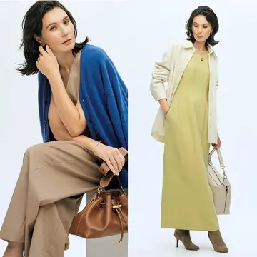 着心地よく汎用性の高い王道ベーシックなワンピースは、ブランドの真骨頂。なかでもバンドカラーは、シャツ襟が苦手な人も着やすく、中にタートルニットやシャツを重ね着するなどアレンジの幅が広いのも魅力。共布ベルトをはずせば、すそに向かって広がるゆったりしたフレアシルエットに。なめらかなストレッチサキソニー素材は、肌にふれてもチクチク感が少なく、自宅で手洗いできるのもうれしい。