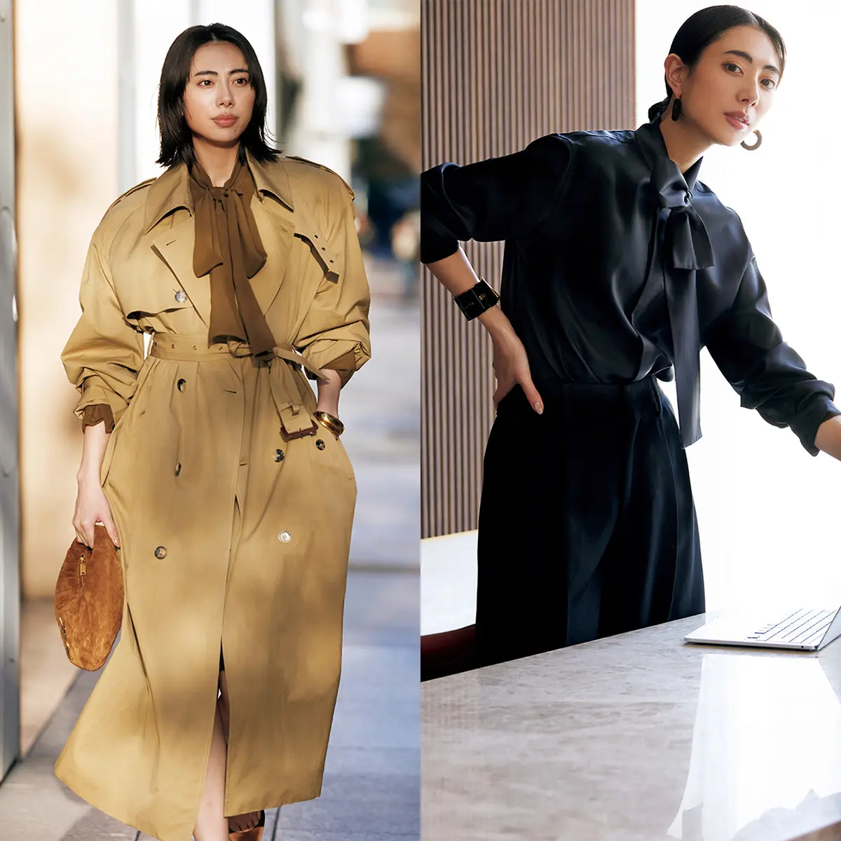 来客の多い日のオフィススタイルには、黒のワントーンスタイルで。この春はいつものシャツをボウタイブラウスにチェンジして、装いの空気をフレッシュに。上質なシルクならではのほどよい厚みと張りが、顔まわりにキレのいい立体感を演出。ラフに結ぶだけでどこか洗練された空気感が生まれ、奥行きのあるたたずまいに。マスキュリンなワイドパンツと合わせ、ノンシャランでどこか余裕のある風情が、ネオエグゼの魅力をより輝かせる。