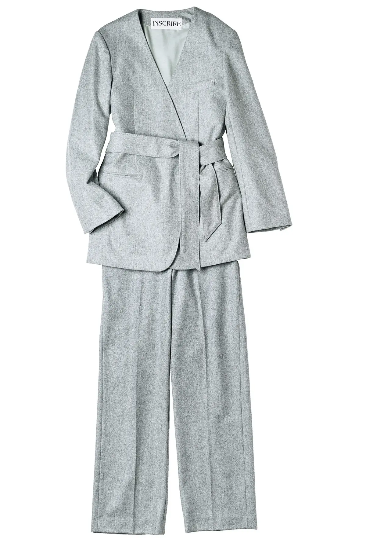 モダンなガウンスーツは 遊び心あるディテールが光る本格派 付属の布ベルトで締めるガウン型ジャケット。ジャケット内側にもポケットがつけられ、袖はボタンをはずして折り返せるように。やや太めのストレートシルエットのパンツは、ウエスト部分の片側にだけ、切り込みが入ったモダンなディテールつき。ジャケットを脱いでもおしゃれな雰囲気。