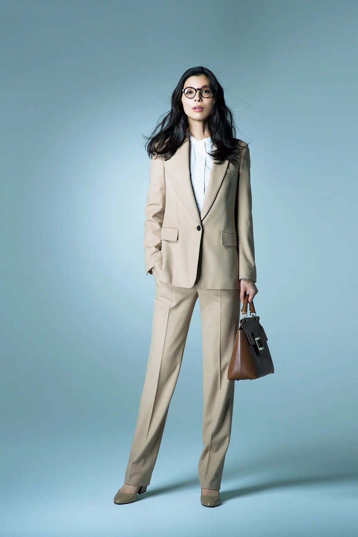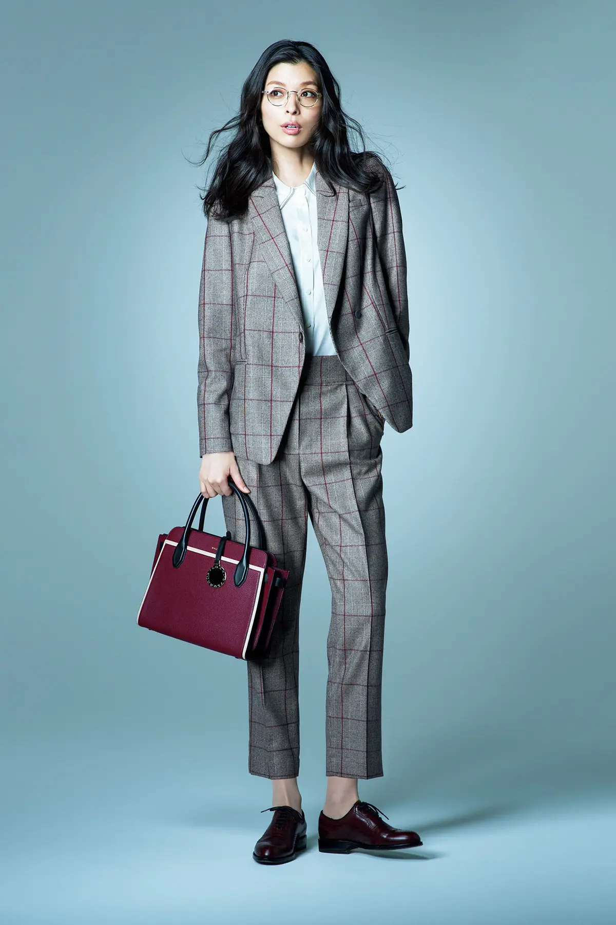 ジャケット¥97,000・パンツ¥59,000(ともにストラネス)・ブラウス¥63,000(バンフォード)/以上三喜商事 メガネ¥27,000/モスコット トウキョウ(モスコット) バッグ¥326,000/ロジェ・ヴィヴィエ・ジャパン(ロジェ ヴィヴィエ) 靴¥78,000/ピエール アルディ 東京(ピエール アルディ)