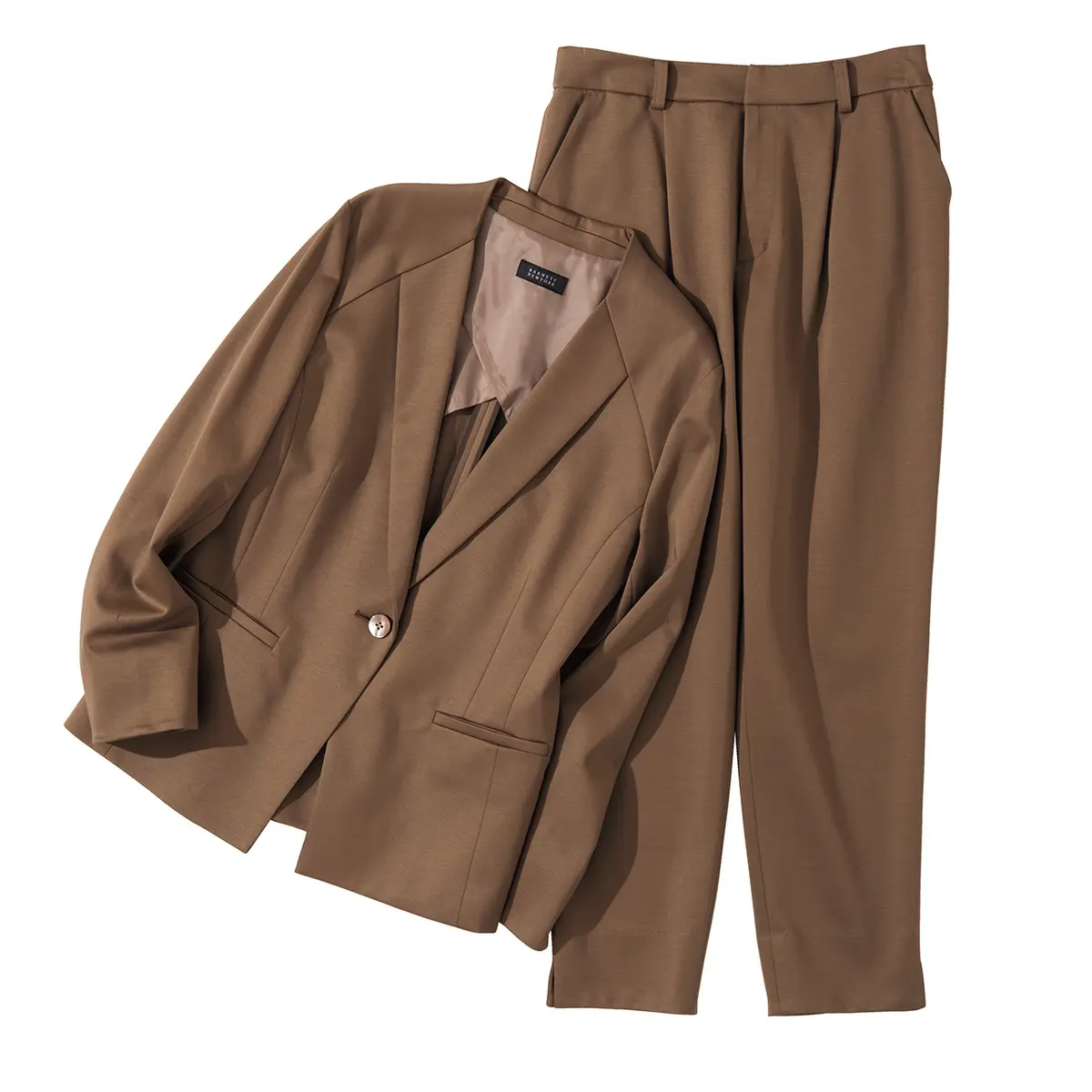 辛口のパンツスーツに、 ミルキーベージュが柔らかさを添えて なめらかなウール地は、エグゼクティブにふさわしい上質なイタリア産を使用。シングルボタンのシンプルなテーラードジャケットは着丈が長めで、体の線をきれいに見せてくれる。美脚ラインのストレートパンツと合わせれば、きちんと感が漂う無敵のスーツスタイルが完成。