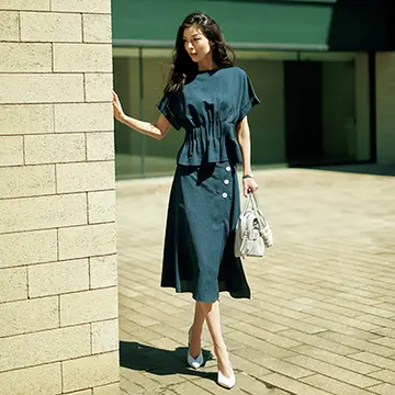 吸水、速乾、接触冷感でしわになりにくい、夏向きの機能素材。トップスは襟つきの比翼仕立てなので、暖色系でも仕事に必要なきちんと感をキープできる。スカートは分量をもたせた優雅なすそながら、ウエストまわりがすっきりとしていて、ラフな印象にはならない。