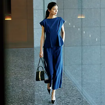 上下セットだけでなく、それぞれ別々に着回すことができるのもセットアップの利点。会議、会食、レセプションなどさまざまなお仕事シーンに対応できるスカートセットアップを、トップスだけ、ボトムスだけを使用したときのコーディネート術とともにご提案。