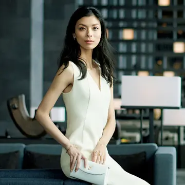 ジャケット¥270,000・ワンピース¥220,000・バッグ¥210,000/フェラガモ・ジャパン(サルヴァトーレ フェラガモ) バングル¥418,000・リング¥250,000/TASAKI