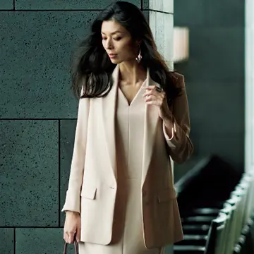 ウエストがシェイプした美シルエットのノーカラージャケットは、ワンピースと合わせると、胸もとのパール飾りが映えて、ノーブルなドレスアップスタイルが完成。フェミニンなデザインと、凛とした存在感を添える色鮮やかなサックスブルーが好バランス。