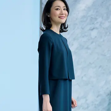 もたつきなどのストレスを感じず、快適に着用できるところがコーディネート見えするワンピースの長所。ボウタイブラウス部分はシルク、スカートはツイードとどちらも表情豊かな素材同士の組み合わせは、おしゃれ感も格別。まだ肌寒い早春には、ブランドを代表する上質なカシミヤを使ったネイビーのコートを。