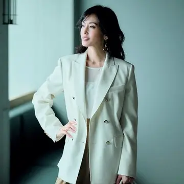 エレガントなダスティピンクのカラーや、ダブルボタンのサイドに施されたダーツなど、着映えポイントが満載。ストレッチ入りで動きやすいのも働く女性にうれしい。
