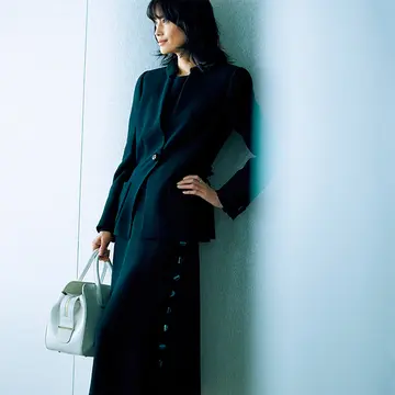 ジャケット¥95,000・ワンピース(上と同じ)/ドゥロワー 青山店(ドゥロワー) メガネ¥29,000/アイヴァン PR(アイヴァン) バッグ¥480,000/ヴァレクストラ・ジャパン(ヴァレクストラ) 靴¥125,000/ジミー チュウ