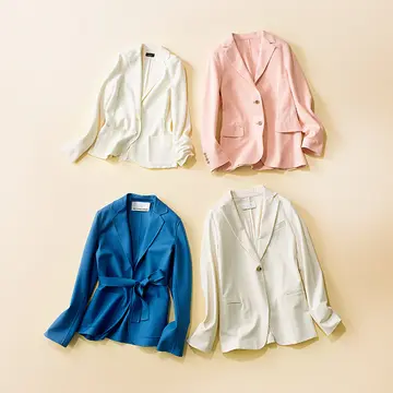 春は強い色で主張するのではなく、ベージュや淡いブルー、グリーンなどのクリーンな肌映えカラーで、さわやかかつ柔和な印象を演出したい。リネンのように涼しげな素材感もねらい目。