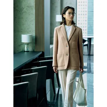 ニット¥161,700・スカート¥172,700/三喜商事(アニオナ) ジャケット(ラペルピンつき)¥132,000/トヨダトレーディング プレスルーム(ラルディーニ) メガネ¥37,400/アイヴァン東京ギャラリー(アイヴァン) ピアス¥30,800・バングル¥69,300/ブランイリス エストネーション六本木ヒルズ店(ブランイリス) バッグ¥330,000/ジョルジオ アルマーニ ジャパン(ジョルジオ アルマーニ)