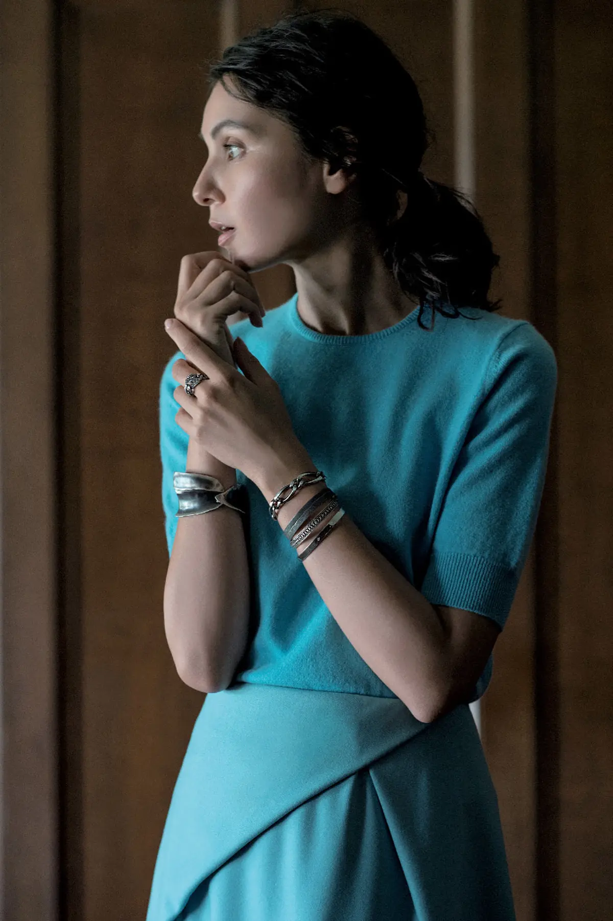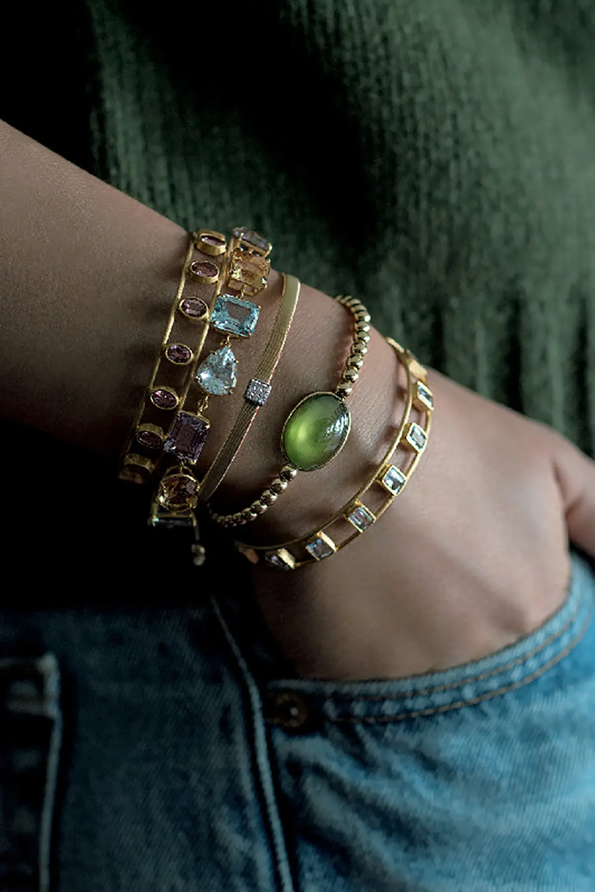 次々に素敵なジュエリースタイリングを披露してくれる伊藤美佐季さん。最もこだわっている手首盛りの基本は、素材ごとにメインのブレスレットを決めること。ゴールド、色石、パール、シルバー。今、気になる4つの素材で伊藤流コーディネートをご紹介。
