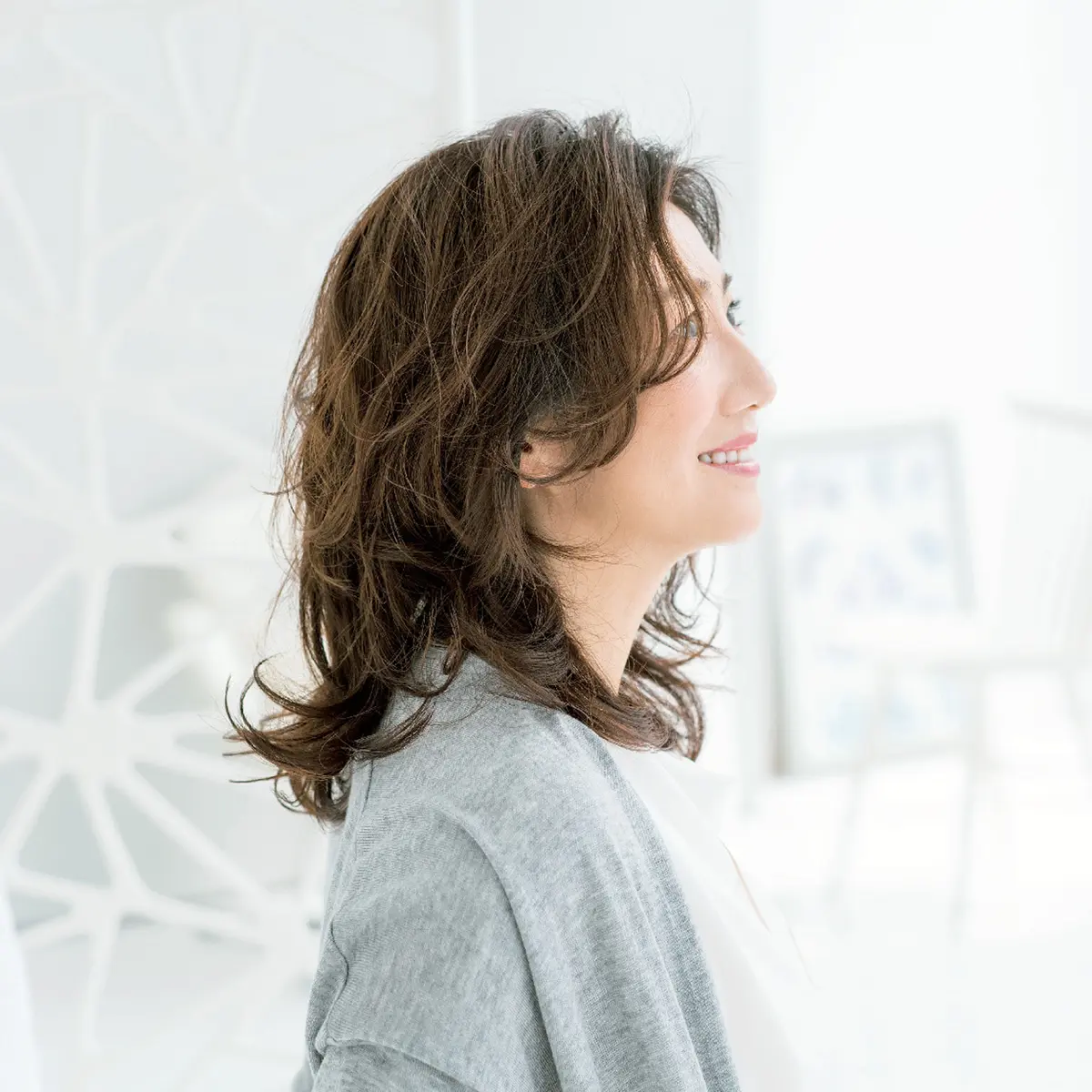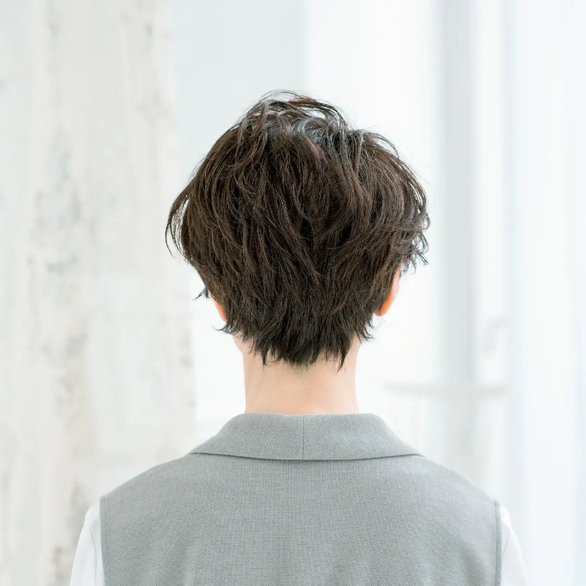 「今また流行の兆しがあるソフトなウルフカット。レイヤーでくびれをつくるのですが、必然的に分け目がつきにくくなるうえに、くびれでメリハリがつき、トップの髪がふんわり見える一石二鳥のスタイル。毛先側はレイヤーを控えめにして、ある程度ボリュームを残すので昔風にはなりません。ハイライトを入れたカラーリングで、動きをつけることも今どき感の演出につながりますよ」