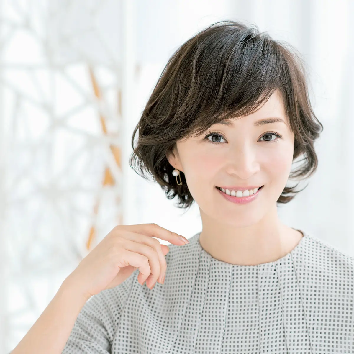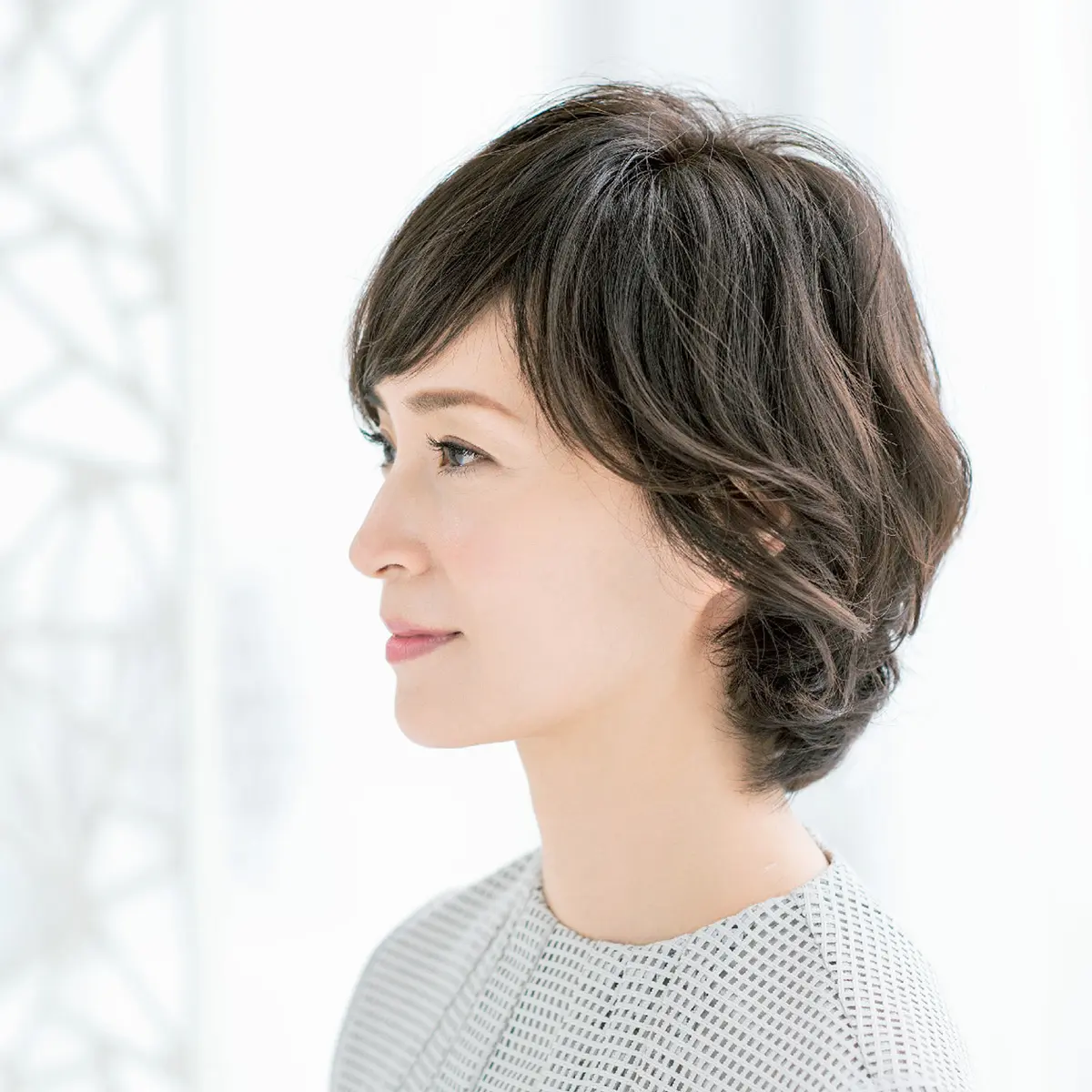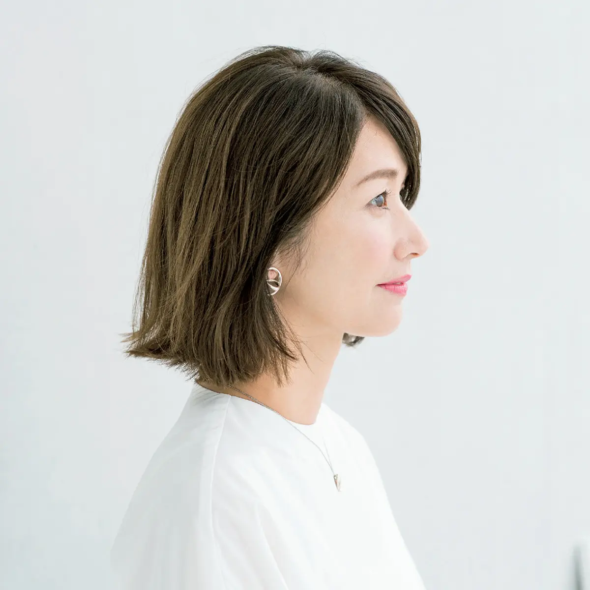 「Aラインと呼ばれるプレーンなボブは、ボリュームゾーンが下にいきがち。トップのペタンコ感が強調されやすいんです。そこで重心をキュッと上げ、全体をたまご型の美人フォルムに。サイドにトップとつなげたレイヤーを入れると、自然な毛流れが生まれ、必然的に頭頂がふんわり。短い前髪をサイドの髪になじませ、長く見せたのもトップのボリューム感にひと役買っています」