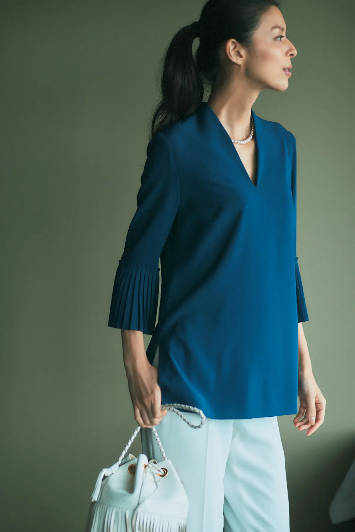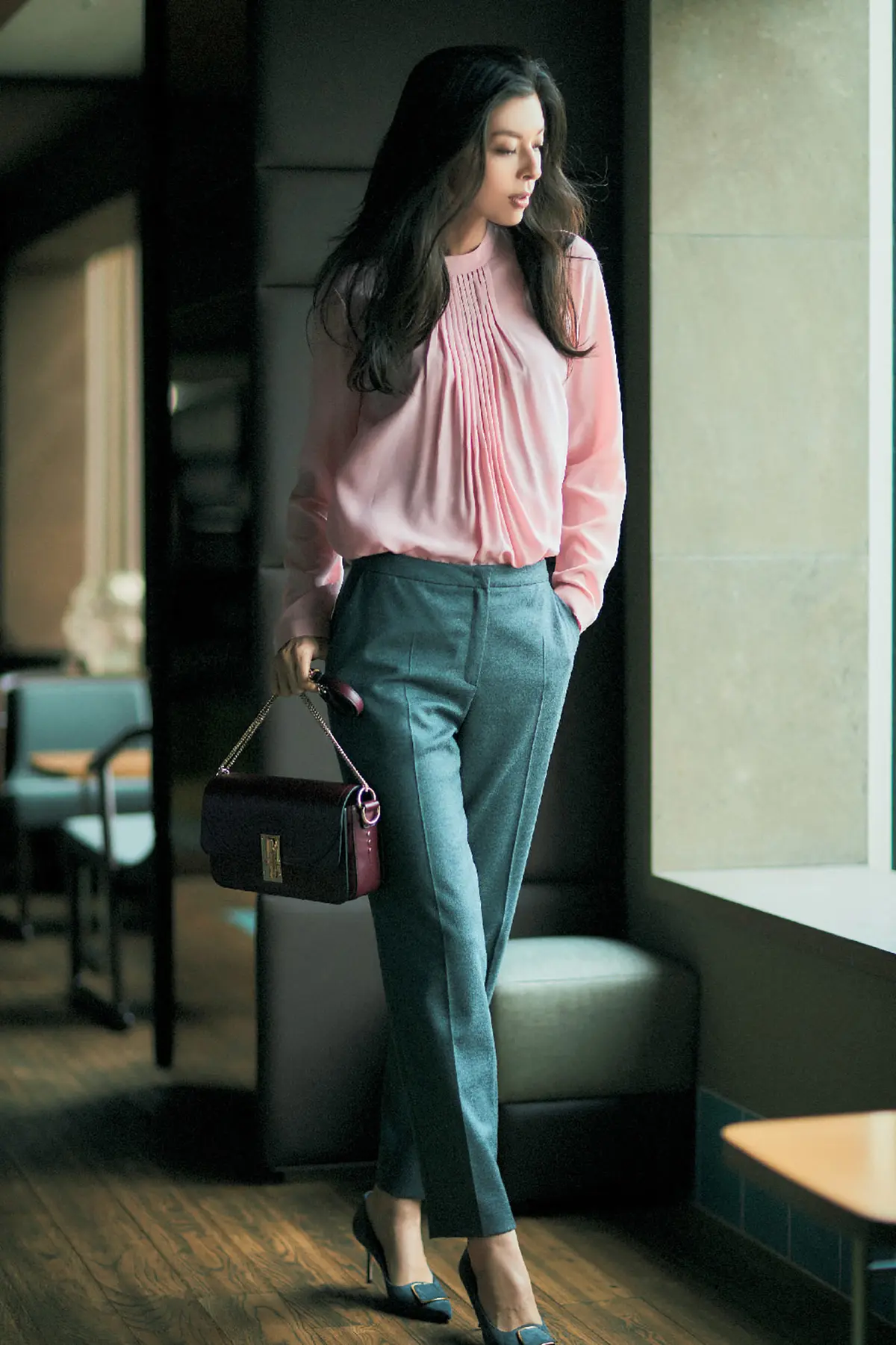 会食の場では華やかなだけではなく、ほどよくまじめさもミックスされたブラウスが大正解! ねらいたいキーワードは、光沢感、適度な肌見せ、華ありディテールつき。いずれかの条件をクリアすれば、働く女性にベストな会食スタイルが即完成!