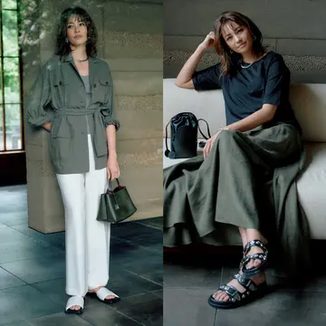 手持ち服を生かしながら鮮度高く、涼やかに盛るコツをスタイリストの斉藤くみさんが伝授。ドライな女らしさを生むカーキをコーデのどこかに取り入れて、夏素材のままシックな色で秋を先取り!