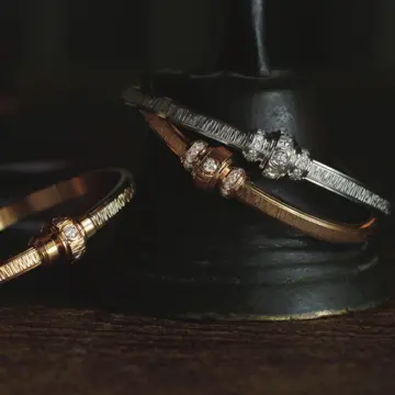 〈左〉回転するリングが特徴。幅や深さの異なる極細線を彫り入れたパレス装飾が繊細でありながら、独自の存在感を放つ。「幸運や成功をイメージさせるポジティブさが魅力のコレクション。かなえたい願いに合わせてつける指を選ぶのもいいですね」。リング「ポセション」〈上から〉(WG×D)¥968,000・(PG×D)¥638,000・(WG×D)¥871,200・〈左〉(WG×D)¥444,400/ピアジェ コンタクトセンター(ピアジェ)