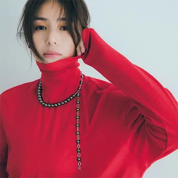ベージュニットとつややかなアコヤ真珠は、最高に相性のいい組み合わせ。エッジの効いたVのフォルムが印象的なコレクションは、アコヤ真珠の新たな可能性を感じさせる注目のアイテムだ。Vのフォルムをパールロングネックレスとチェーンネックレスで重ねればニットスタイルにリズムが生まれ若々しく。インに着たシャツとパールの白のリフレインもおしゃれだ。