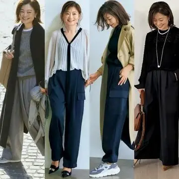 カーキ寄りのブラウンは少しドライでボーイッシュなイメージ。それでいて、ブラウンならではの優しさも装備。カジュアルすぎない光沢のあるパンツが、ラベンダーニットの優雅さをほどよくくずして新鮮なニュアンスに。