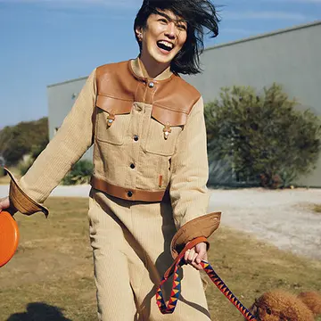 ブルゾン¥1,397,000・スカート¥651,200・ピアス「シェーヌ・ダンクル・パンク」(SV)¥191,400・靴¥475,200・犬用フリスビー¥37,400・犬用リード¥134,200/エルメスジャポン(エルメス)