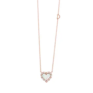 今回登場するのは、グリーンのマラカイト、白のマザーオブパール、赤のカーネリアンという3種類のジェムストーンを用いたハート。この可憐なモチーフを円と長方形を交互に連ねたメタルで縁取るデザインが、ハートをより上品でモダンな印象に昇華してくれます。ピンクゴールドもしくはイエローゴールドのシンプルで華奢なチェーンを合わせたネックレスなら、可愛らしいハートモチーフもさらりと身につけられ、洗練された大人の可愛げをアピールできます。