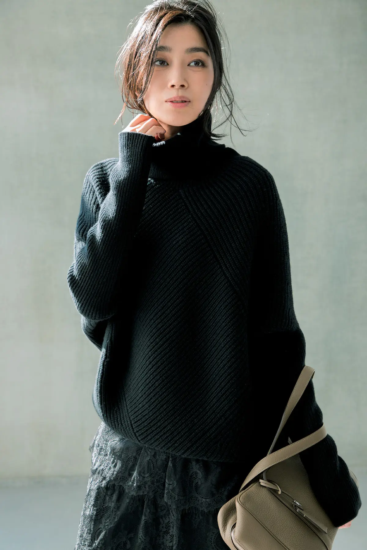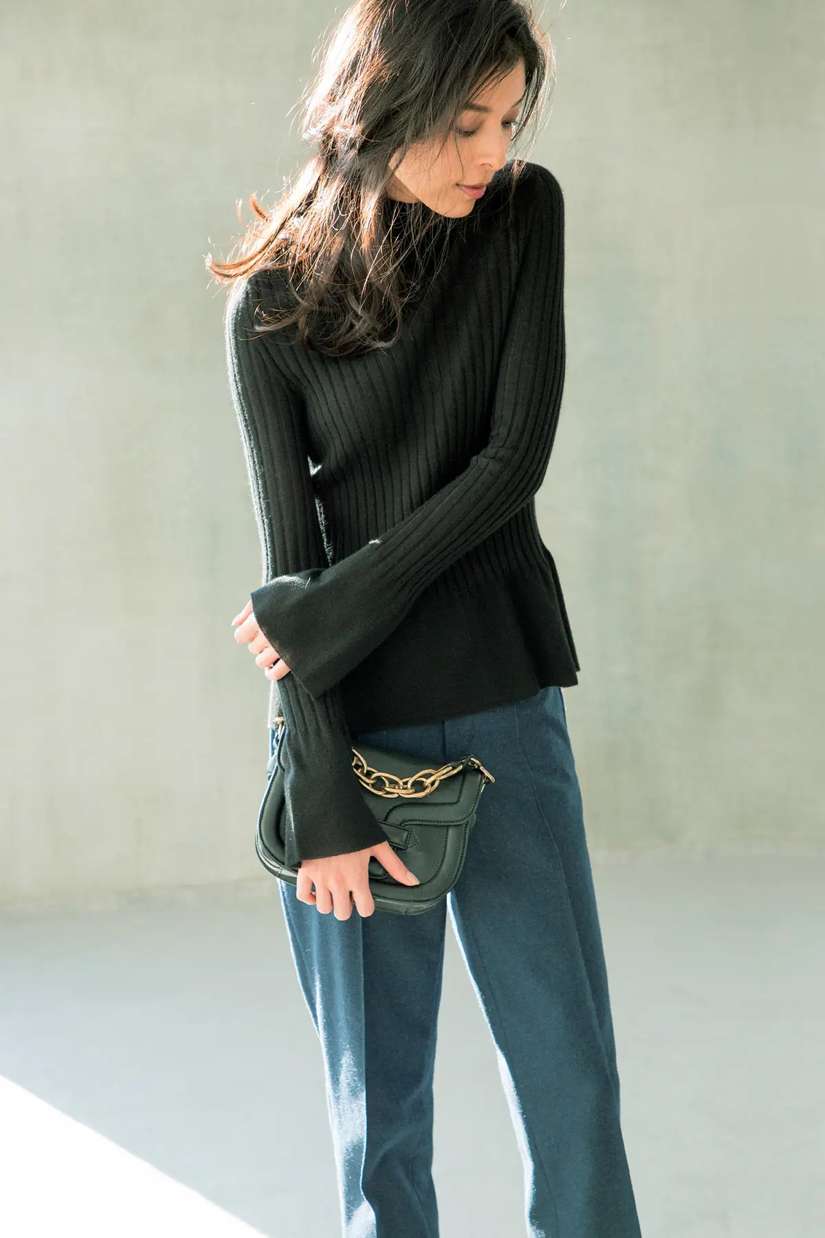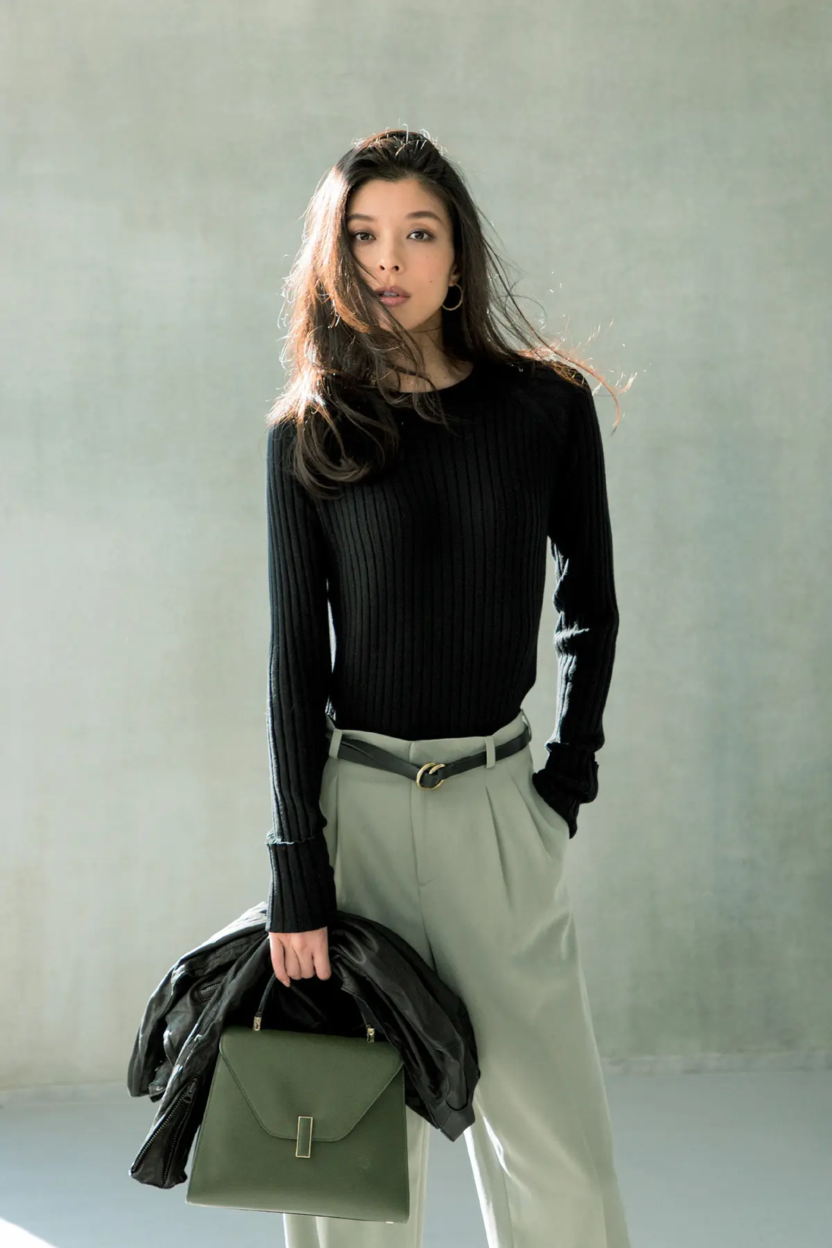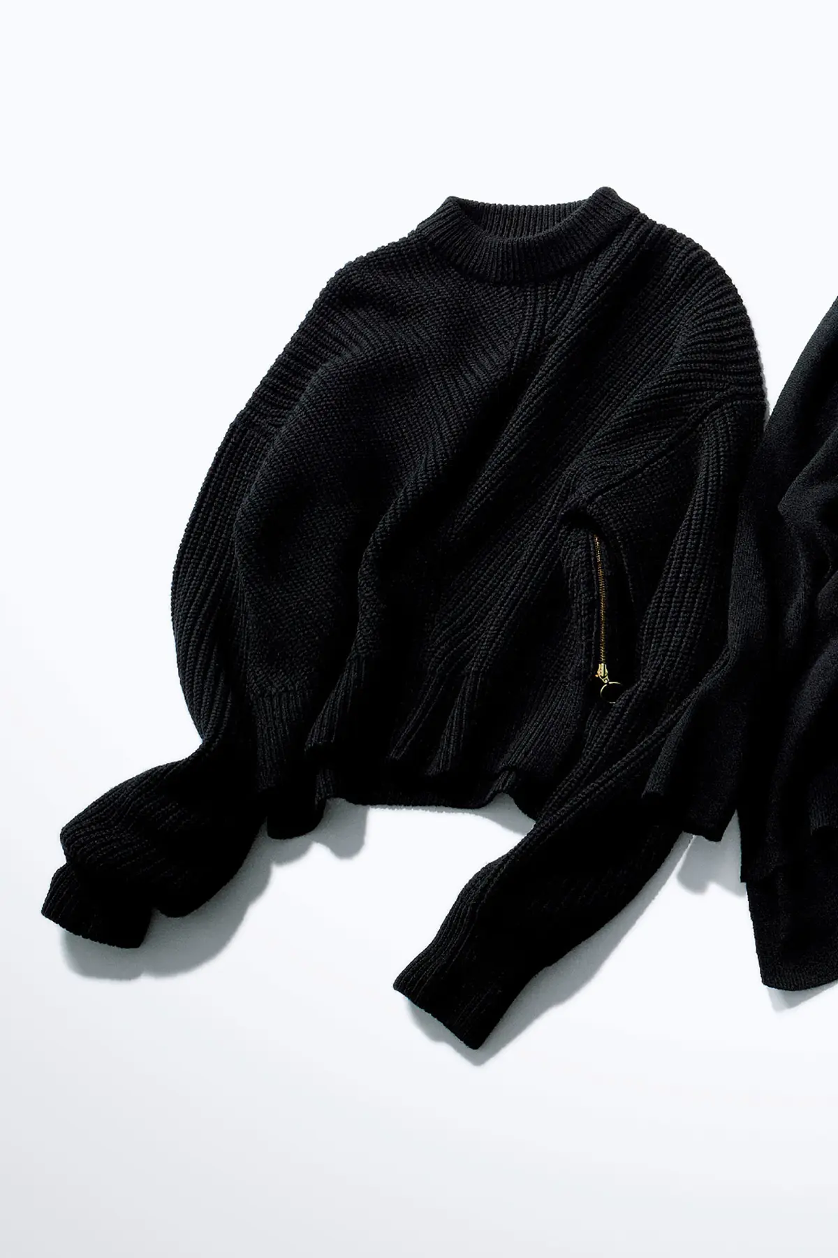 たくさん持っているゆえ、ついつい主役級のものに手がのびそうになったとしたら、一瞬立ち止まって! 黒ニットの重要な役割は、合わせやすさしかりの、"引き立て役"。まずはアラフィーの体をほっそり見せてくれる、リブニットをお届け。