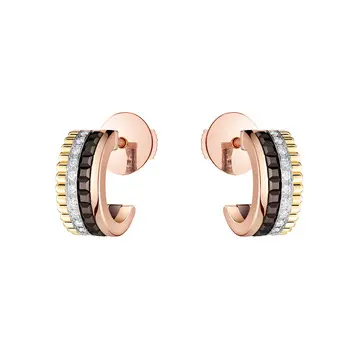 〈左〉「キャトル クラシック 2モチーフ タイネックレス」(YG×PG×WG×D×ブラウンPVD)¥1,254,000(予定価格)・〈右〉「キャトル クラシック フープイヤリング ミニ」(YG×PG×WG×D×ブラウンPVD)¥720,500(予定価格)/ブシュロン クライアントサービス(ブシュロン)