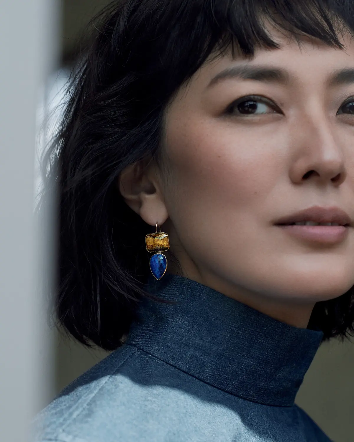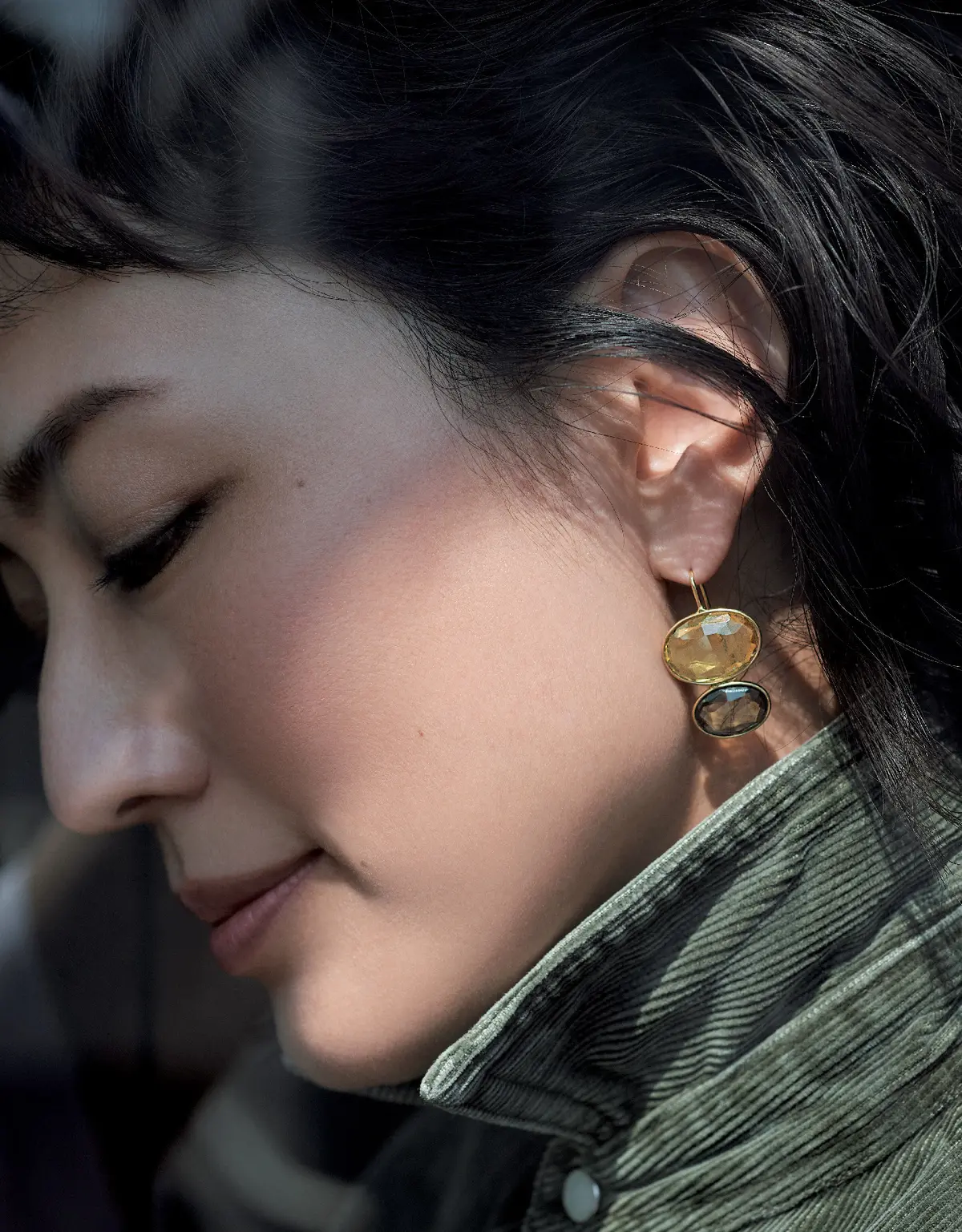 「色石を身に着けていると本当に力をもらえるもの。今身に着けるならピアスがおすすめ。ピアスは、表情に対して美容液なみの効果があるものだと思っています。大人になればなるほど、つけるだけで一気に表情も肌色も明るくしてくれる。できたら気分まで上げてくれるものを選びたいですね」と伊藤さん。今回コラボレートしたのは、石のカットから加工まですべてハンドメイドで製作するラ・スール。細やかなディテールワークと、日本人の肌が美しく見える色合いは、毎日つけたくなる魅力にあふれている。