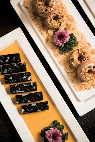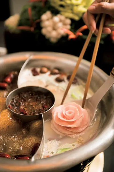 台湾の鍋といって、きっとすぐ思い浮かぶであろう2色スープの鍋。台北にお店は数多くあれど、どうせ行くなら、独自のプレゼンテーションで台北マダムの人気を集める『寬巷子』へ。野菜はブーケのように盛りつけられ、機械ではなく一枚一枚包丁で削ぎ切りして出される豚肉はバラの形で登場する。ほかの具材もロリポップを模した湯葉巻き、ヌガーやドーナツをかたどった練り物など、日本では見たことがない! そして重要なのは、香り高いスープもそれぞれの具材も、どちらも味がすばらしいこと。