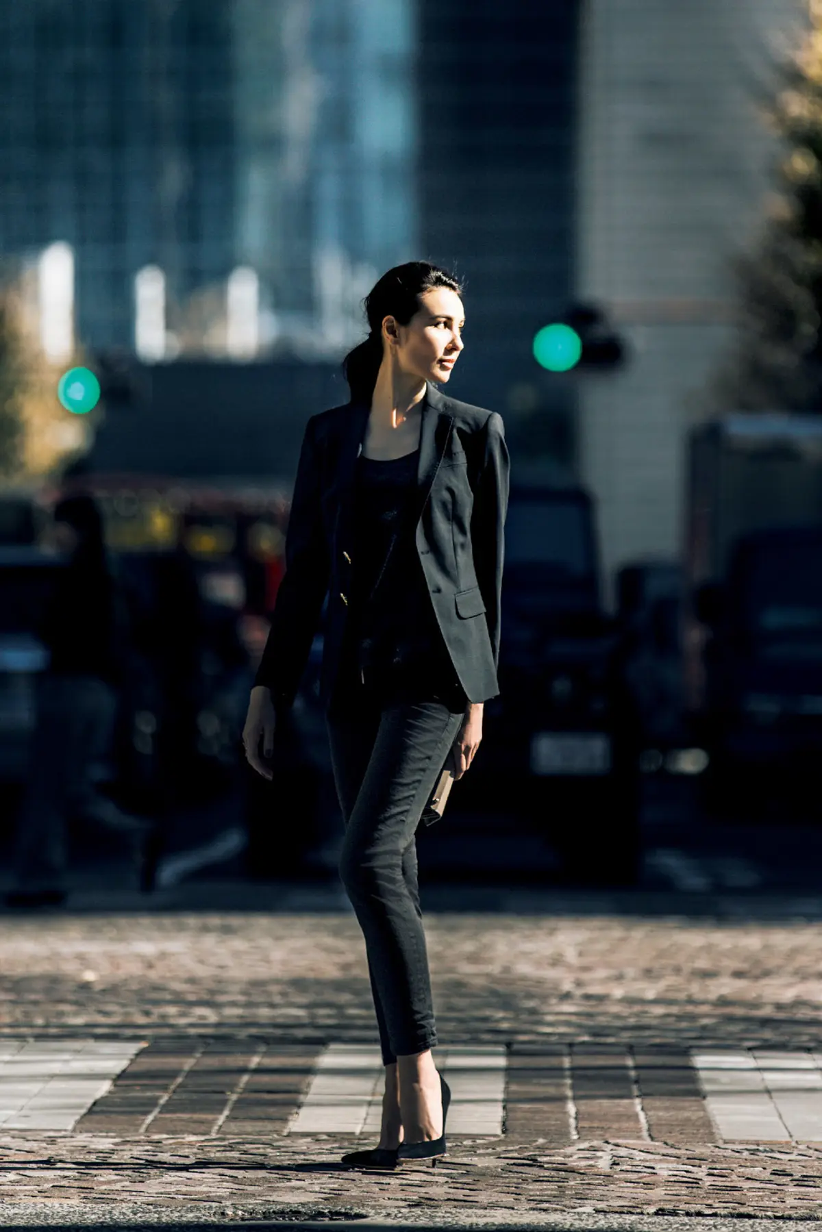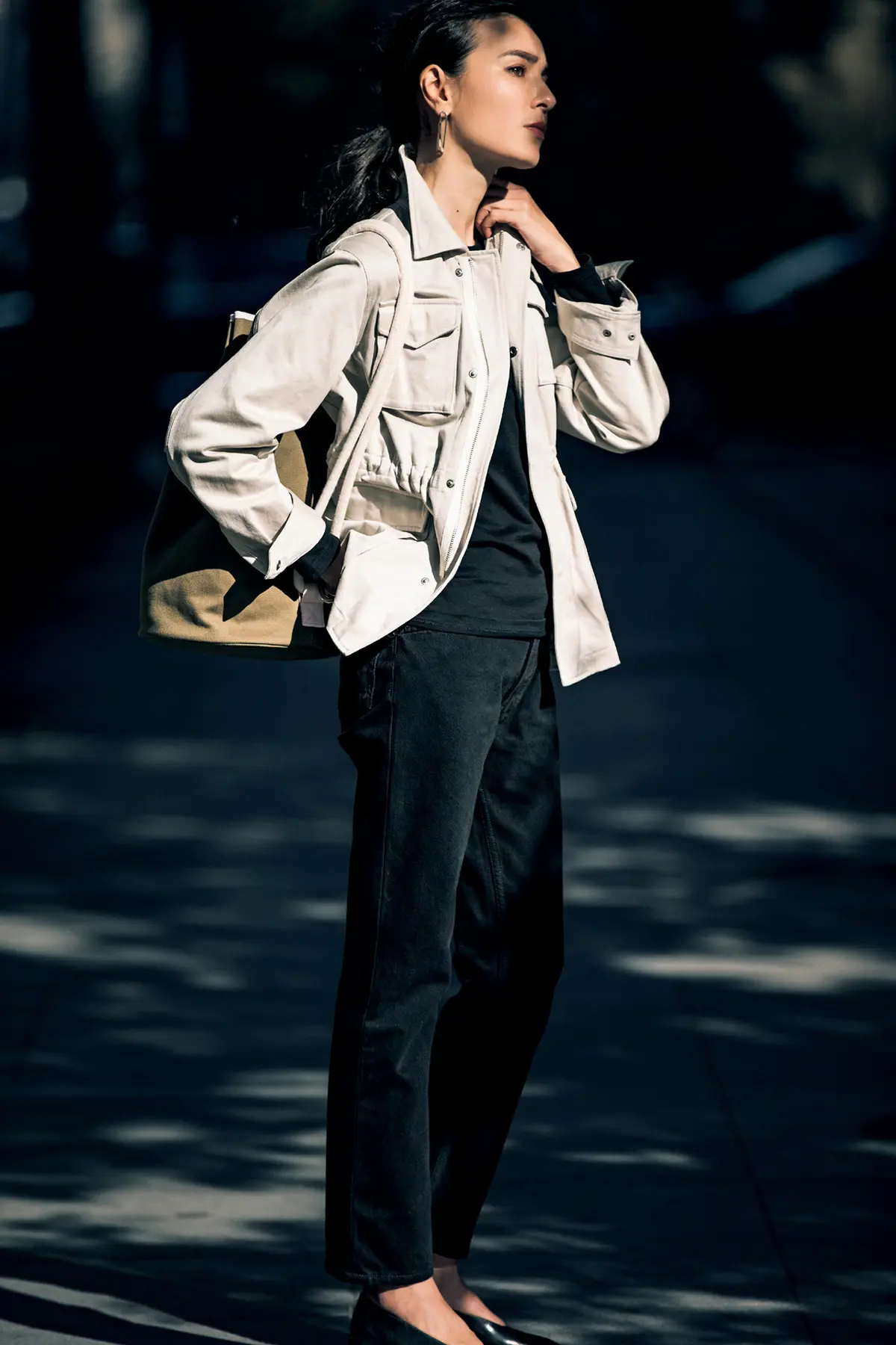レースジャケットのきれいめ感と、ウォッシュ加工を施したブラックデニムの組み合わせは、リュクスな大人のムードとラフなこなれ感が絶妙バランス。ホールド力があるのに肉感を拾いすぎないストレッチ性、また、膝とすそに少しゆとりのあるシルエットが、脚を細くまっすぐに見せてくれる。