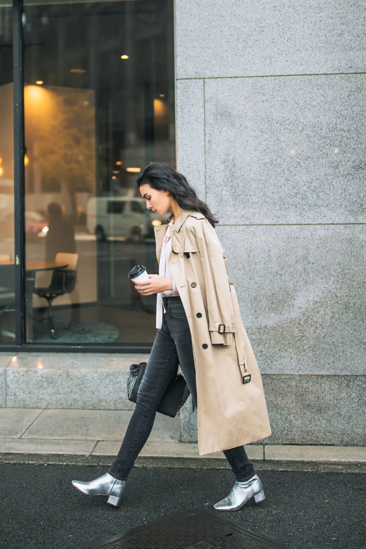 腰から足首まで包み込むハイライズデニムがあれば、トレンチとの組み合わせも無難にならず抜群に今っぽい。淡いピンクのボウタイブラウスで女らしく、足もとはシルバーのブーティでエッジを効かせて。振り幅の広いミックステイストを、デニムがほどよく中和して受けとめてくれる。