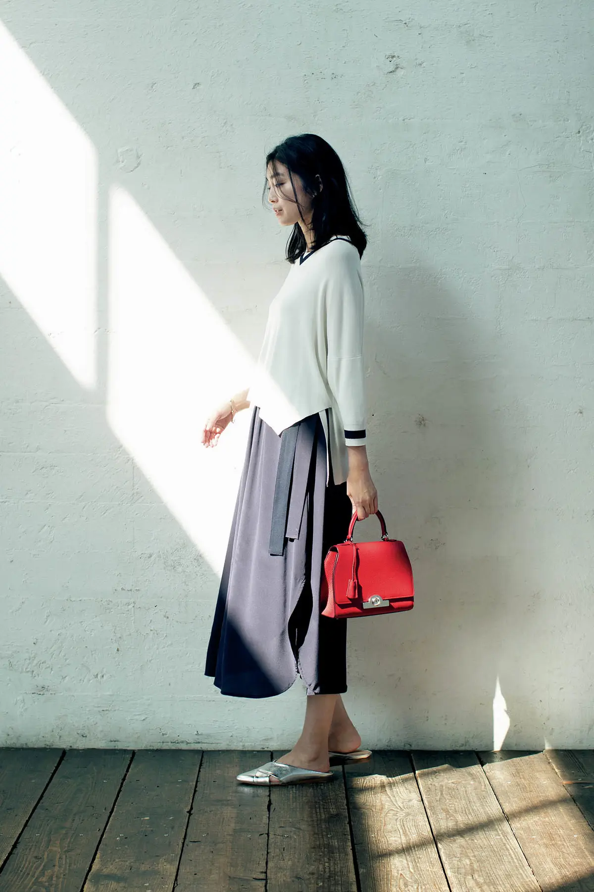 とろんとしなやかな素材感は、それだけでフェミニン。動きに合わせて優雅にたなびく様が大人をひときわ美しく見せてくれる、そんなスカートを手に入れて、足もとはトレンドのフラットシューズを合わせよう。