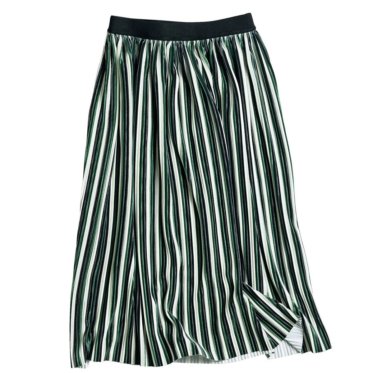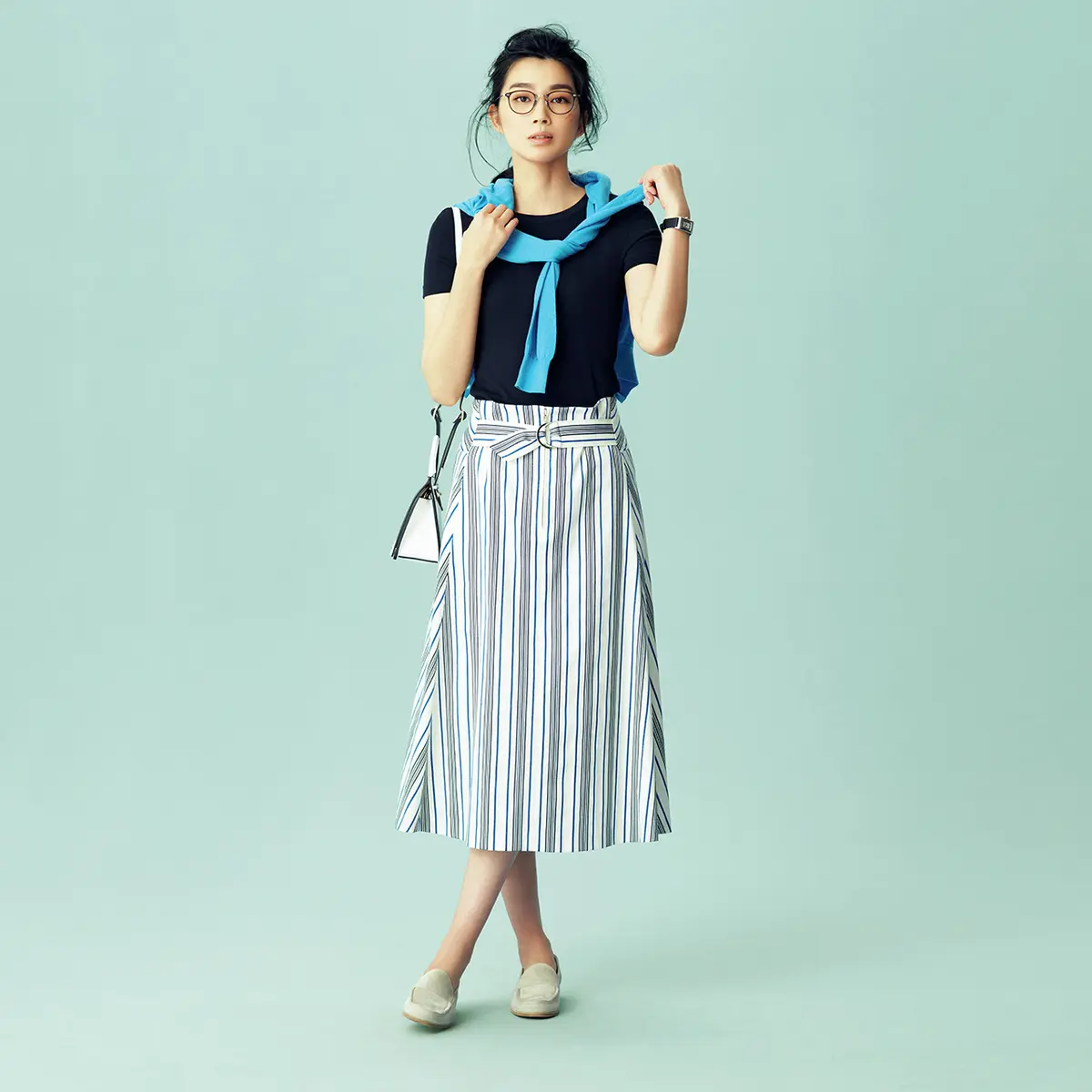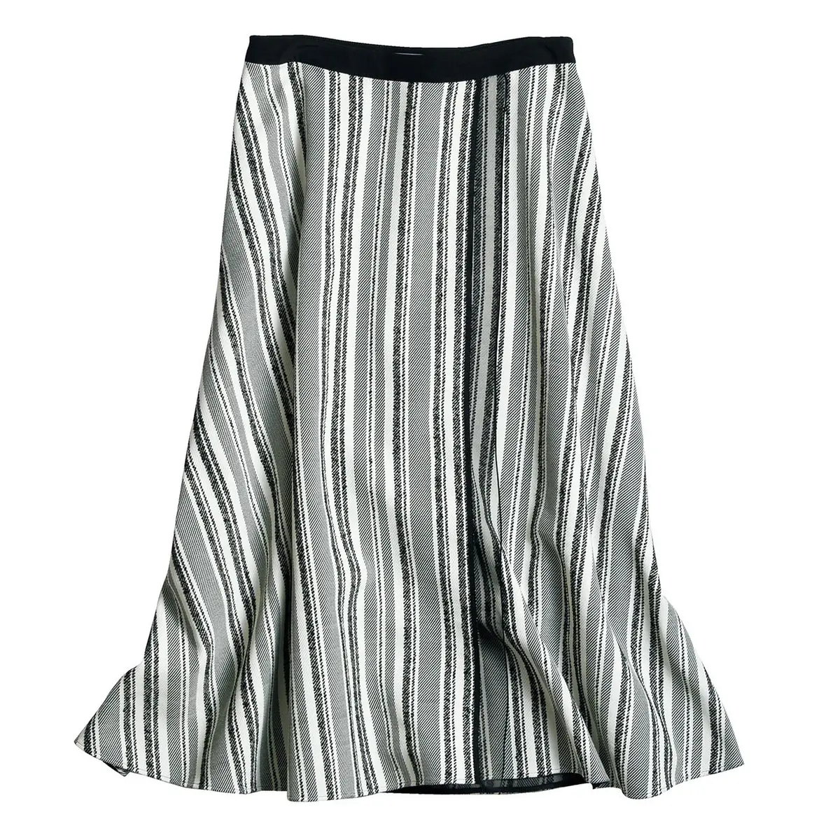 ボーダーよりも辛口でシャープ、オンオフともに使いやすいこなれ感は、カジュアルといえども、ほどよくきれいめに装いたいエクラ世代にぴったり。スカートは辛め配色をチョイスして、すそ揺れもクールに!