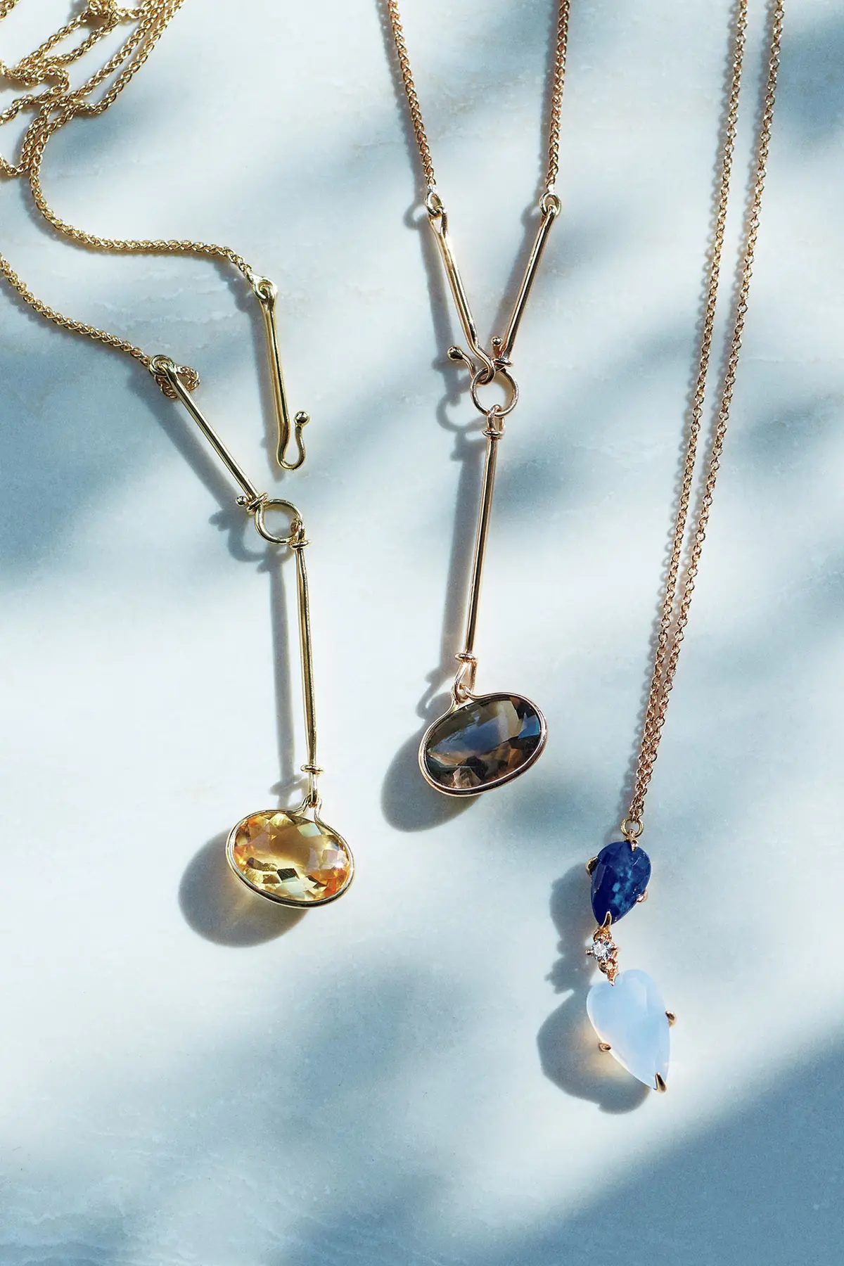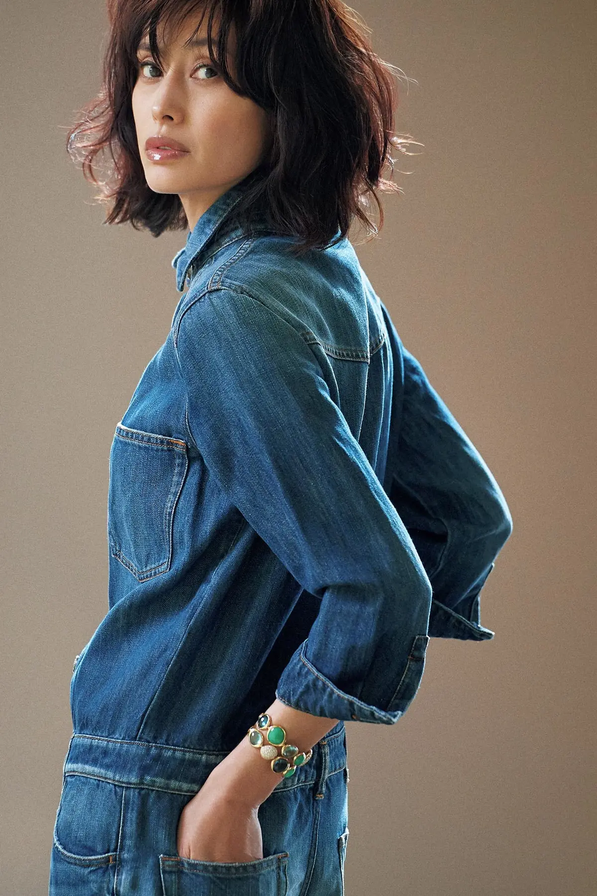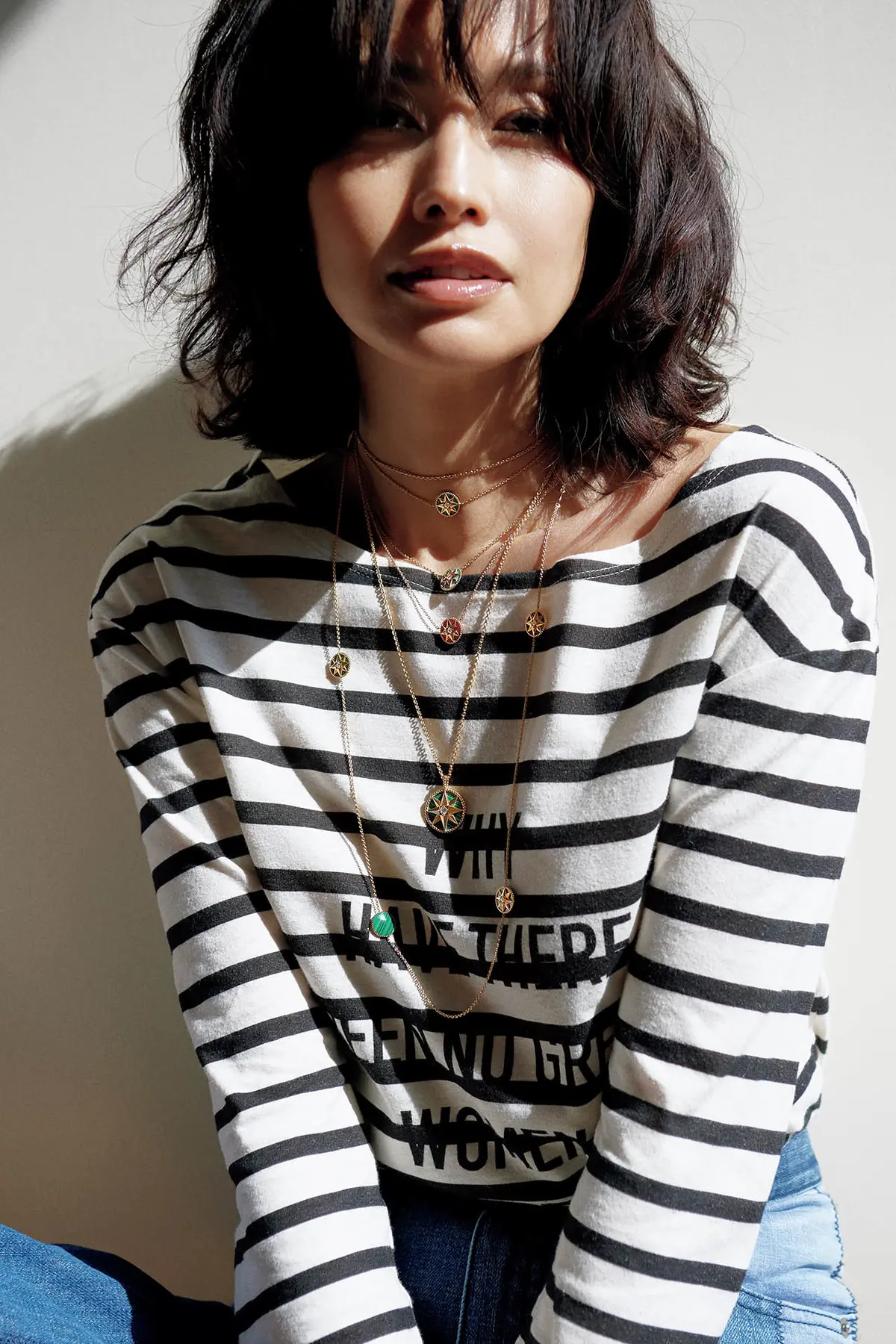いつもの装いに初夏の香りを運んでくれる存在感ある色石ジュエリー。アイテムごとの効果的な装い方で、モデル・高橋里奈さんがつけこなした。