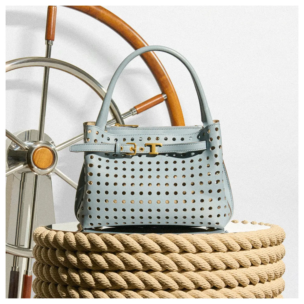 ツヤのあるオールホワイトの、スタイリッシュなセットアップ。足もとはあえてシャープにせず、ボリュームのある黒のプラットフォームサンダルで、重めのバランスをつくると新鮮。ラムレザーの上質感が光る一足は、トランクのメタルハンドルに着想を得た、ゴールドのアクセサリーもリュクスなポイントに。