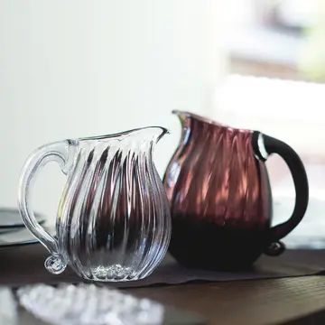 オリジナル品だけを扱い、オーダーも対応。ガラスピッチャー(クリア)¥13,000、(黒)¥15, 000