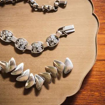 小さな庭が見える空間に古今東西のヴィンテージものが並ぶ店内。なかにはミッドセンチュリーにつくられたデンマークのアクセサリーも