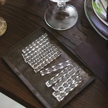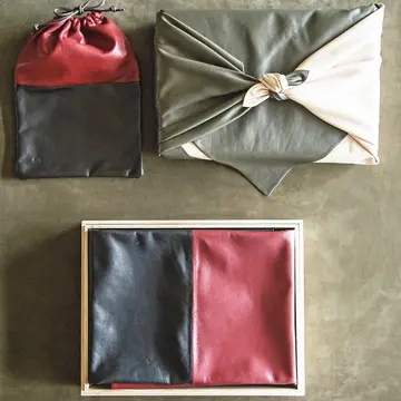 ヨーロッパで収集した上質の皮革を使用し、日本の美意識と熟練を極めた職人の技で仕立てられた風呂敷や茶箱。長年レザーデザイナーとして活躍する千原けいこさんのオリジナルであり、強靭でしなやかな革の特性が作品ひとつひとつに生かされている。革を用いることで用途やシーンを広げ、洋服にも合わせられる寛容さやモード感もある。「大切なものを慈しみしまう所作や、それを美しく見せようとする日本人らしい思いも感じてもらいたい」。京都で培ったセンスや目線で今までにないものづくりに挑戦している。