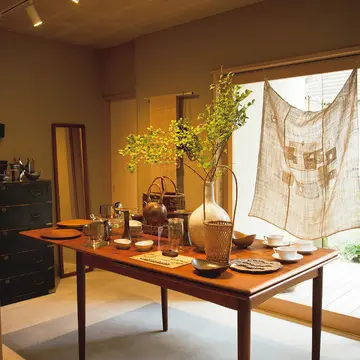 下鴨本通りから下鴨神社の糺(ただす)の森に向かう小さな道にひっそりとたたずむセレクトショップ。北欧のヴィンテージ雑貨や日本やアジアの古道具、器、かご、布、銀製品など、さまざまな国の古いものを扱っている。しかし雑然とした印象はなく、店主のぶれないもの選びの目線があり、ディスプレイは暮らしの一角を切り取ったかのよう。土壁と木を基調とした空間に大きな木のテーブルを置き、庭に植えられた山野草やグリーンにも目が和む。「もの自体の価値や用途がなくても暮らしの中においてみると素敵なものに心が動かされます」。