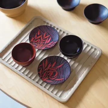 塗りものだけでなく、買い求めやすい拭き漆など、自分が使ってよかったものをセレクト。やなせ文様天廣皿 3.5寸 ¥12,000、高田晴之作・銀杏酒杯¥4,000