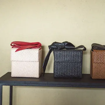 和の趣漂う空間にそっと置かれた茶箱。メッシュの革をボディに使い、くくり部分のラムで柔らかさを出している。各¥80,000