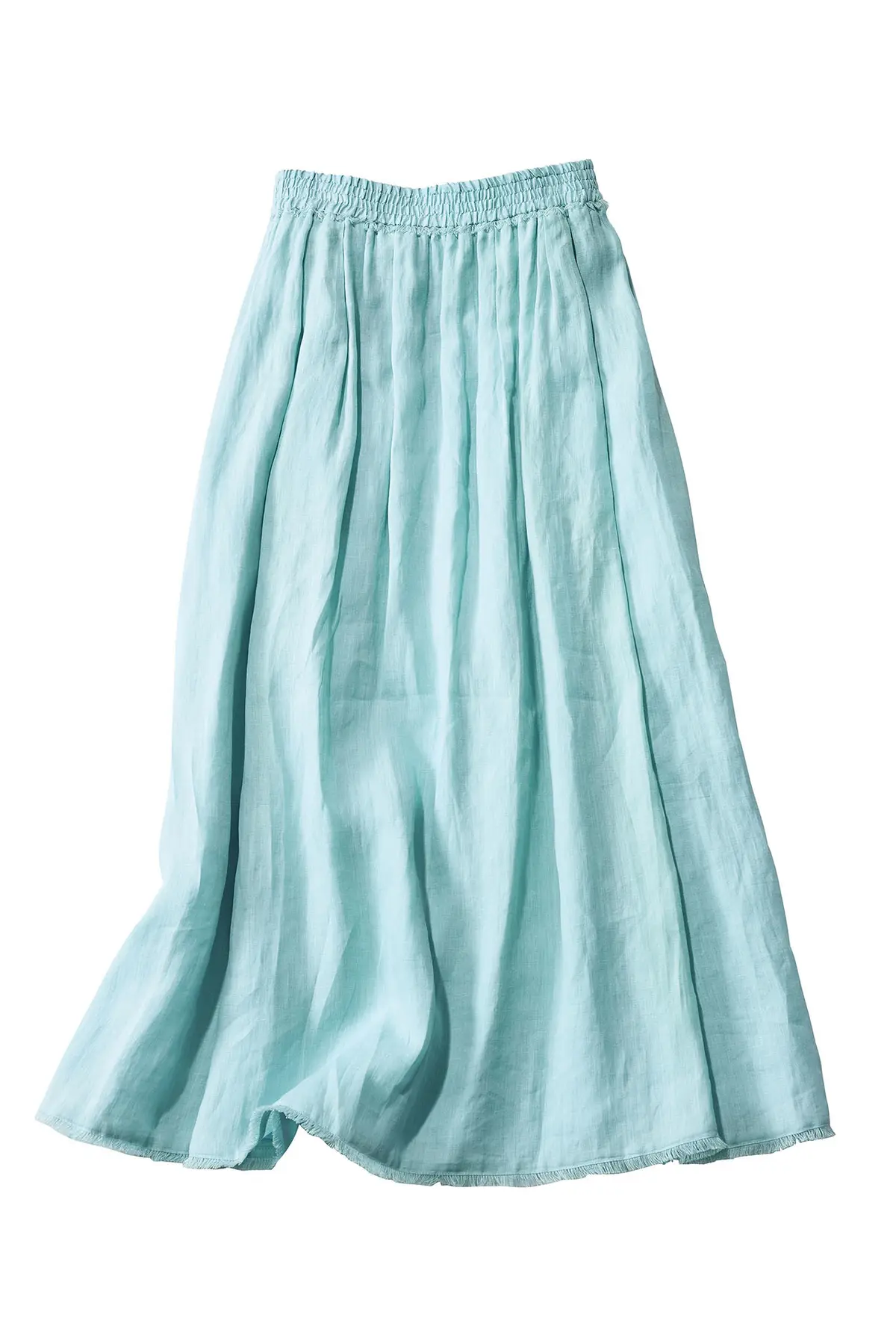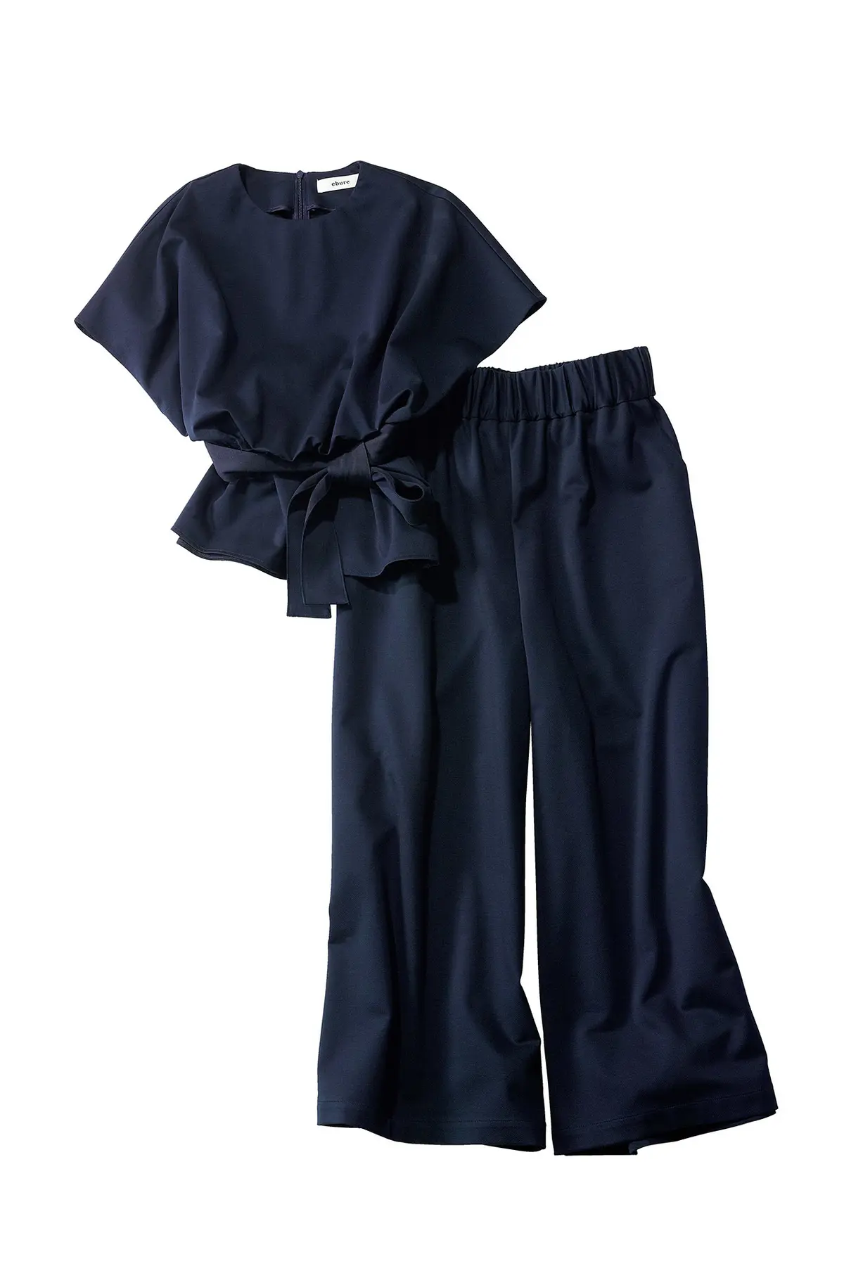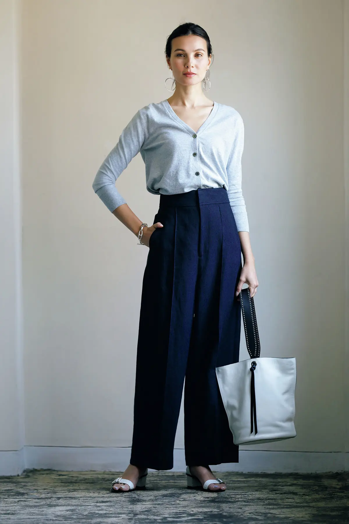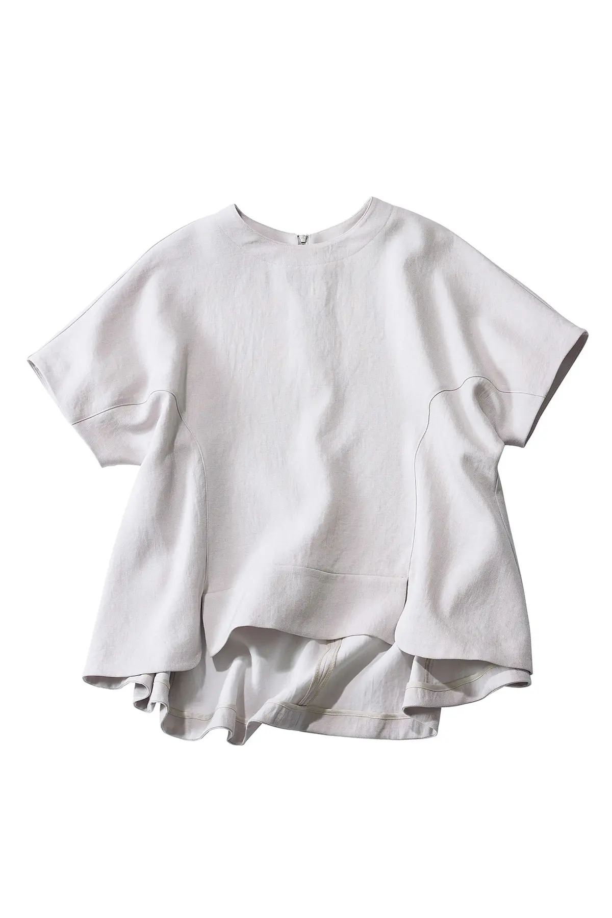 その言葉を証明するのがTシャツやカーディガンなどのベーシックアイテム。どんな着こなしにも必要ながら、ラフすぎる素材では少し違和感を感じてしまうこともあるが、酒井さんをはじめとするエクラ世代のデザインチームが厳選した上質な素材は、コットンやリネンなどのカジュアルなものでも自然なツヤがあり、肌を美しくエレガントなたたずまいに見せてくれる。またミリ単位でこだわったパターンは着るだけで体型をカバーし、女らしさまで演出してくれるから、エクラ世代が夢中になるのもうなずける。