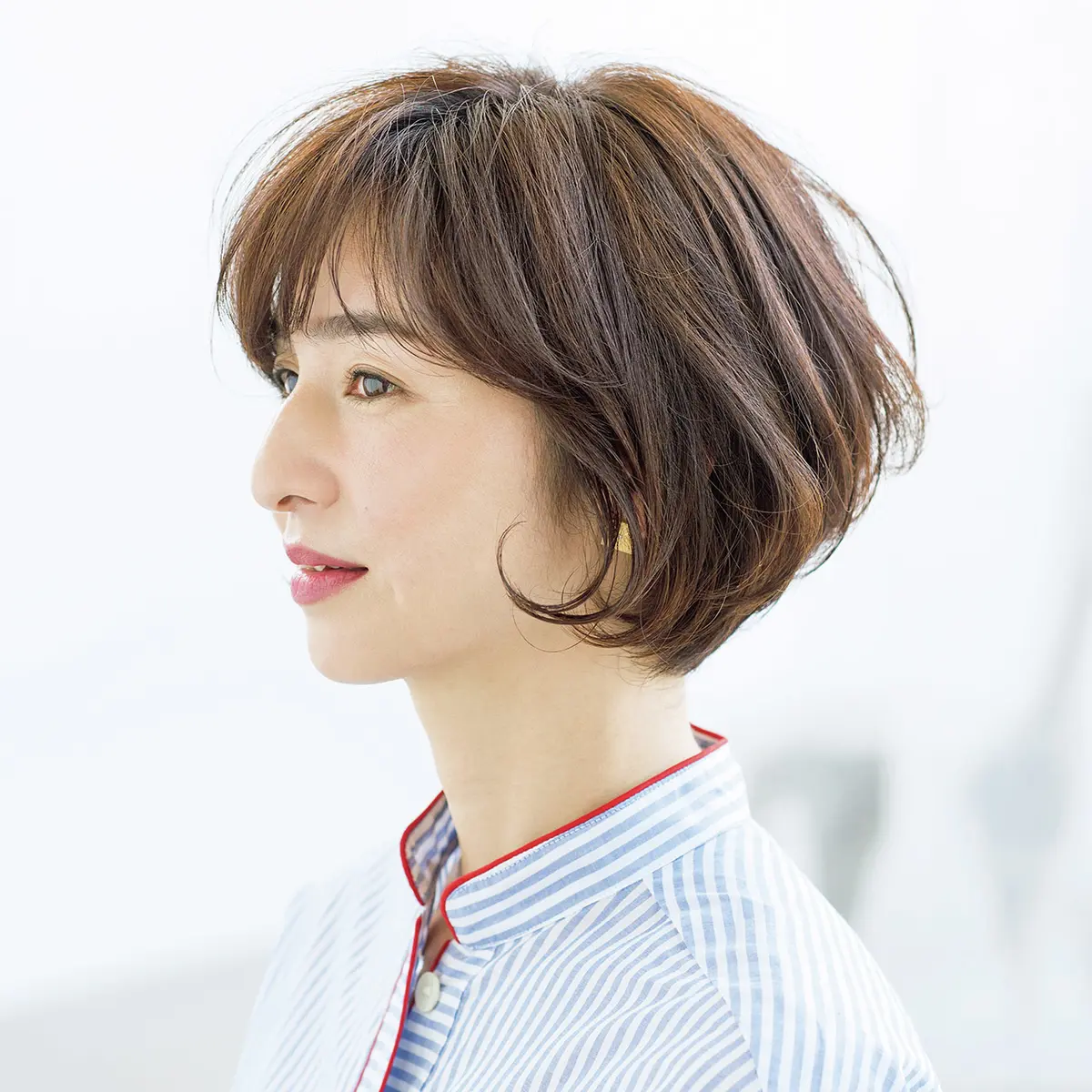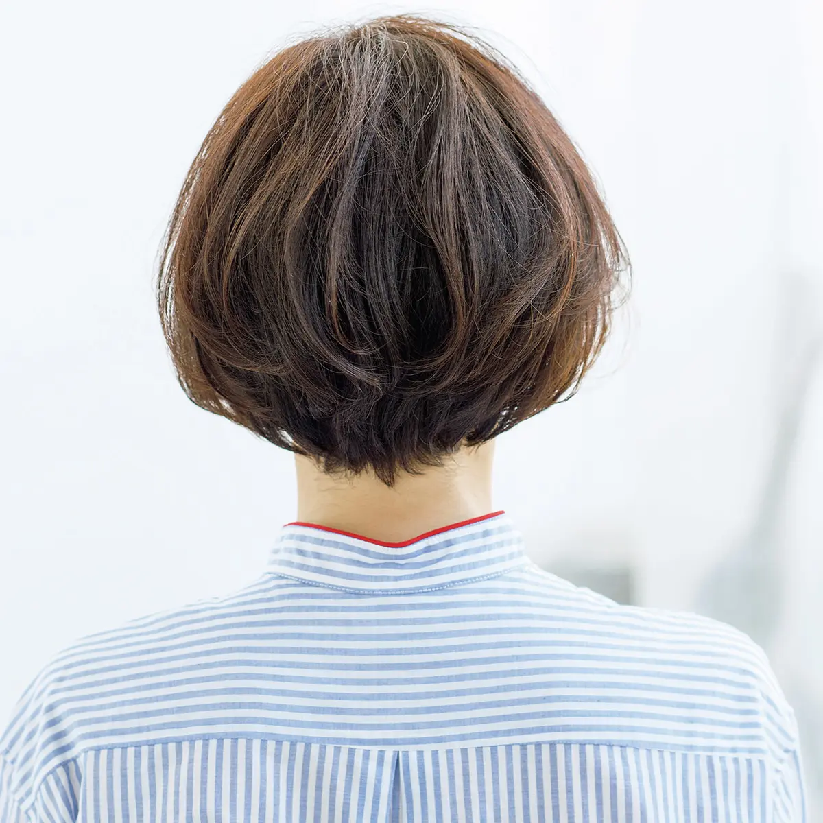 大人に似合うコンパクトなグラデーションボブ。トップはクセの出方を調整しながら、広がる髪質を生かして丸みを出す一方、襟足ともみあげはピタッとシャープに添わせている。広がる髪質を後頭部にも生かすことで、さらにメリハリがアップ。スタイリングはライトハードなワックスで毛先をしっかり動かして。