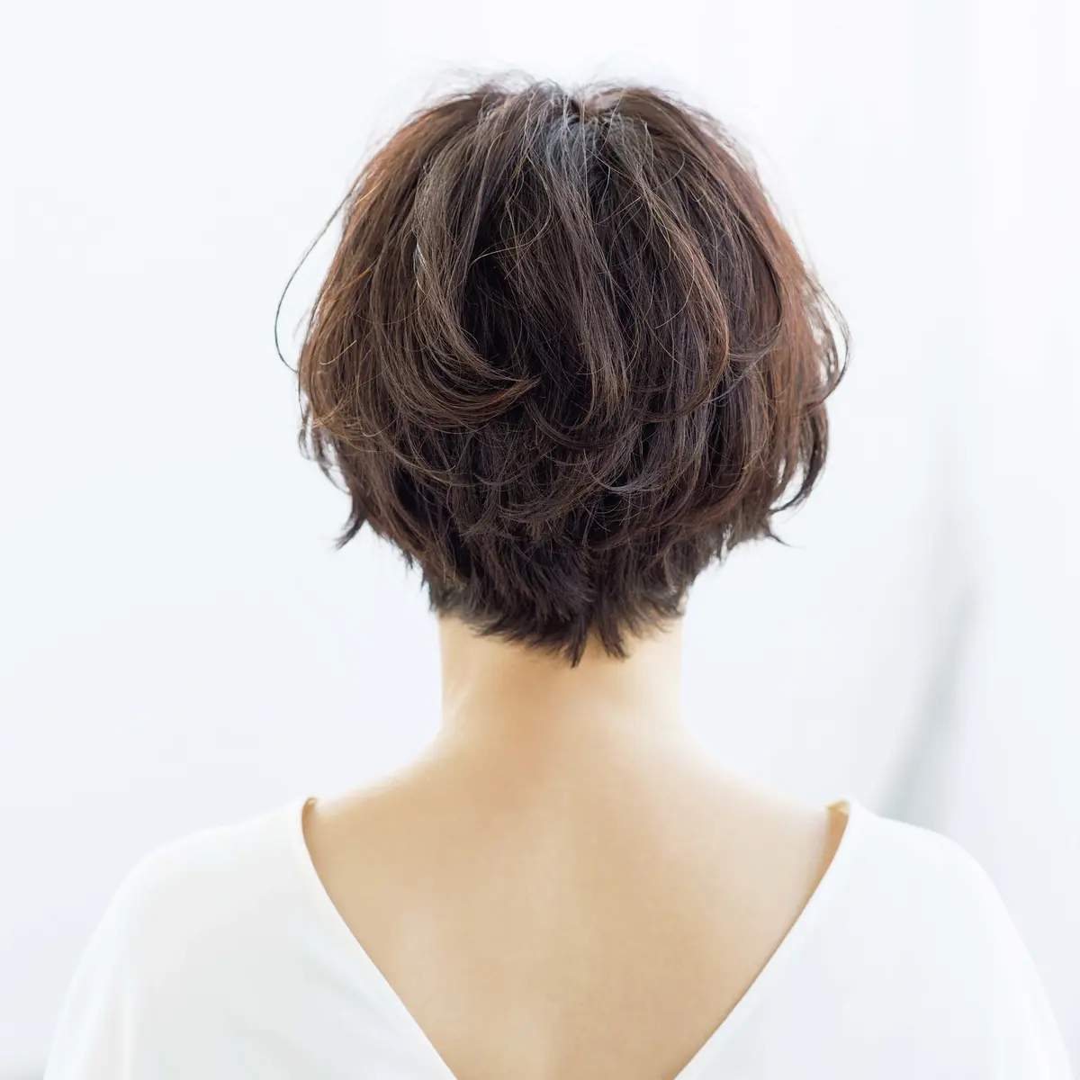 お悩みは、毛先は広がるのにトップはペタンとしやすいこと。まずはカットで奥行きのある前髪をつくり、厚みをキープ。次はトップの根元が立ち上がるように、傷みレスの酸性トリートメントパーマをかけ、丸いフォルムに。加えて毛先にもCカールのパーマをのせたら、しゃれたニュアンスの量感ショートボブが完成。