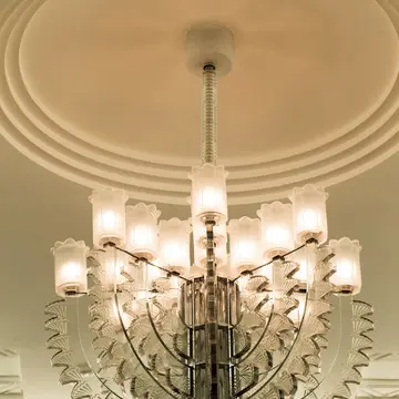 大客室のシャンデリアはラリック製『ブカレスト』。電球のつく部分がツリガネ草の花のようでかわいい