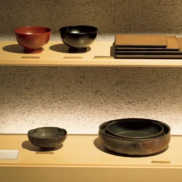 沖縄の気候は、漆の乾燥に最適といわれる。輪島で修業した夫妻の工房「木漆工とけし」の漆器。椀が各¥10,000。下段は、唐津で活躍する土屋由起子の平鉢(6寸¥8,000)と四方皿(¥3,500)。どちらもシンプルで使いやすい