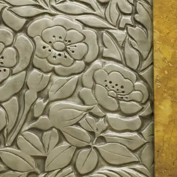 大食堂の壁面。銀灰色の石膏の花模様が橙色の大理石とコントラストをなす