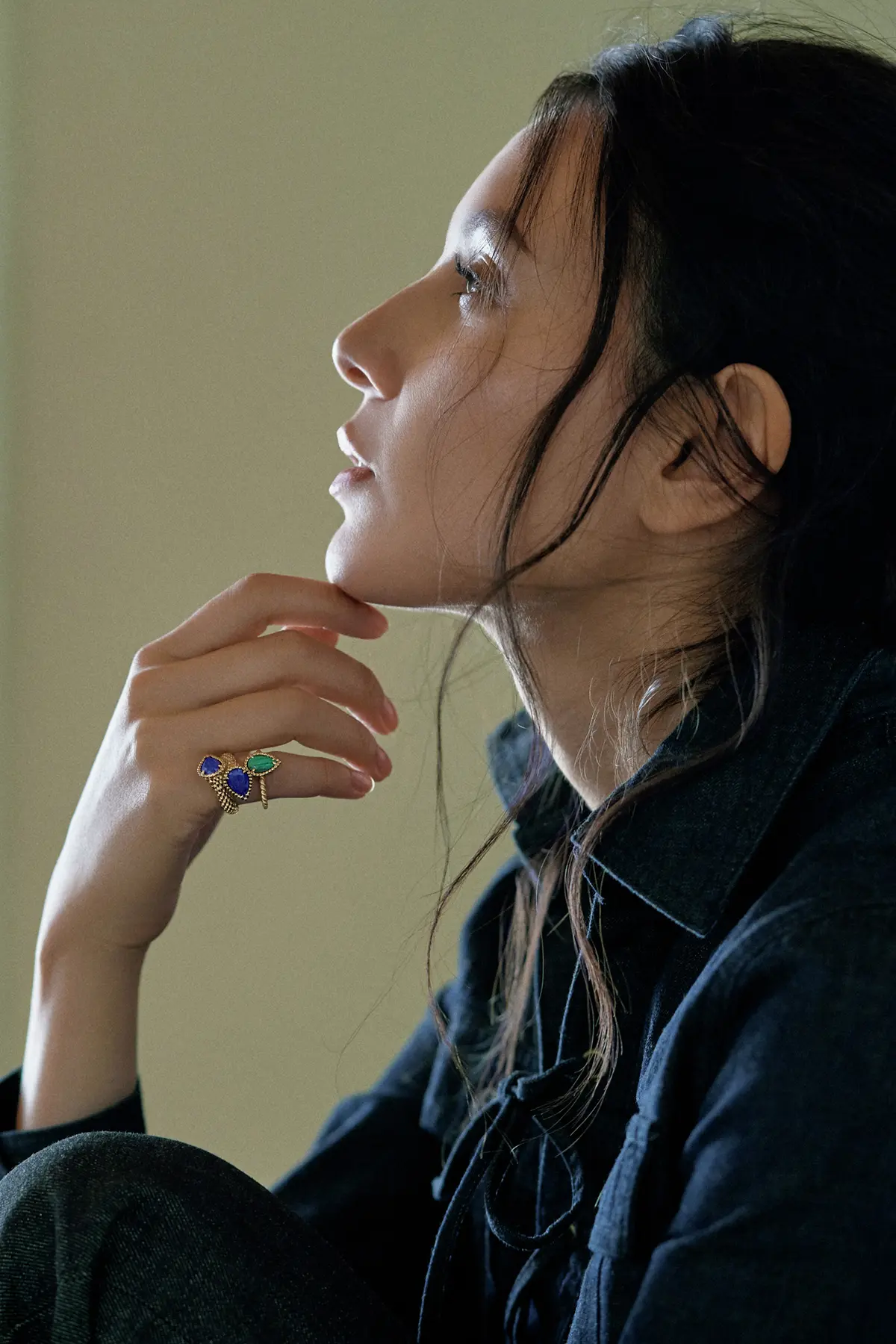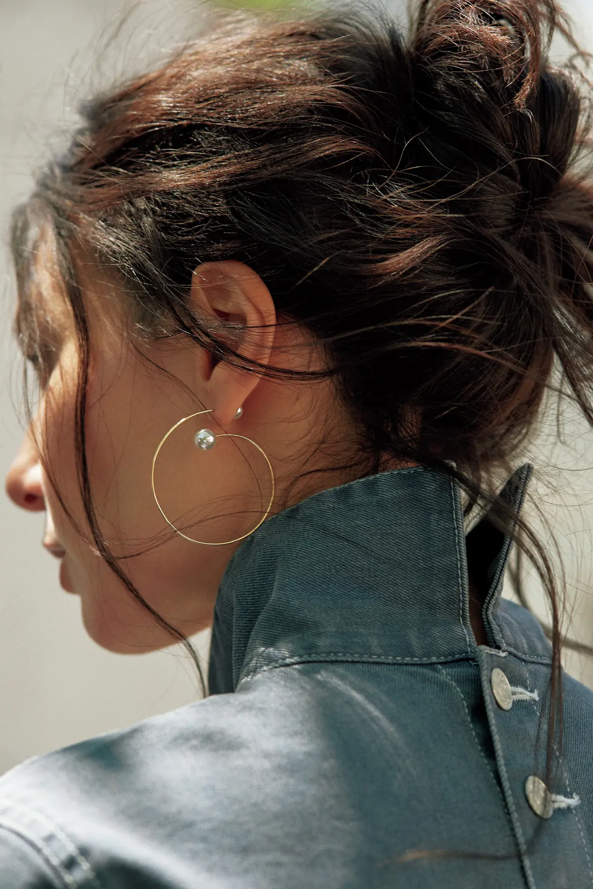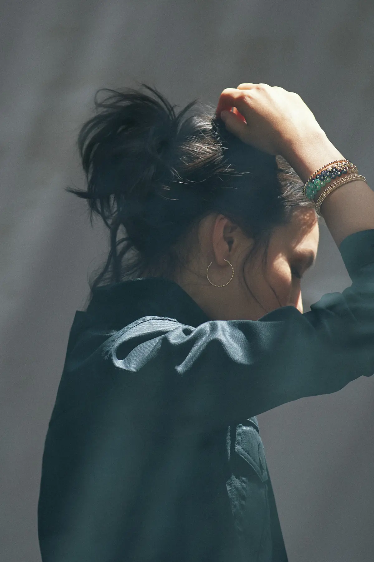 全体の印象は若々しいのにつやっぽく大人の香りが漂う。その秘密はジュエリー使いにあり。「ジュエリーは力んでつけるものではなく、日常に楽しんでこそ」と語るスタイリストの伊藤美佐季さんが、上品なモード感とクラス感が両立するスタイリングをご提案。