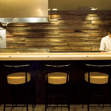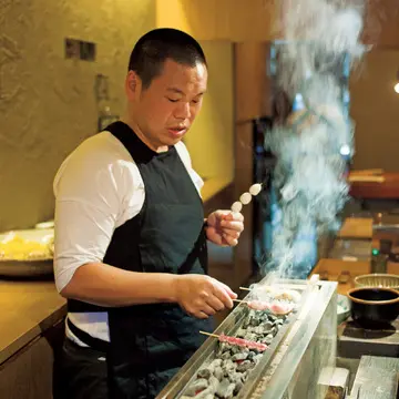 カウンターのみの店内は、和食店のように凛としたたたずまい。焼き台の前に、腹がけを粋に着こなす小林龍治さんが立つ。店でさばく朝引きの丸鶏を備長炭で焼き上げる焼き鳥は、見た目から実に端正。味わえば部位ごとの風味、食感が下処理と焼きで適切に引き出されているのがしっかり感じられる。その味をさらに引き立てるのが、400種をそろえるナチュラルワイン。聞けばフランスやイタリアから来日中の生産者が、東京や京阪から焼き鳥目当てに訪れることもあるとか。作家ものの器使いもセンスにあふれ、上質な時間を過ごせる。