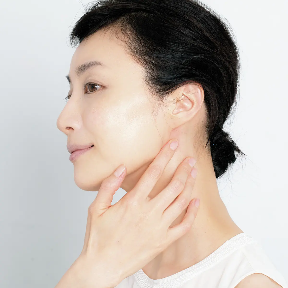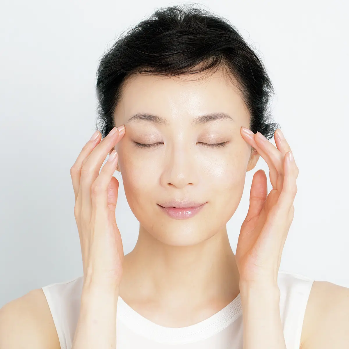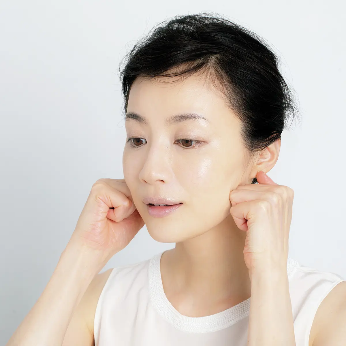とにかく上へ。そんな気持ちから、ついスキンケアやマッサージ時には力が入りがち。「顔の形が変わるくらいの過激なマッサージは、コラーゲンを破壊するおそれがあり、逆にたるみを招いてしまいます。血流を促進する程度の適度な力であれば、マッサージは効果的。たまった老廃物や脂肪など、たるみの原因に直接働きかけることもできます」。