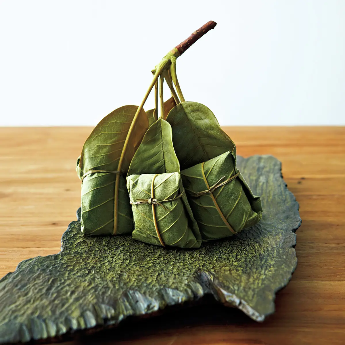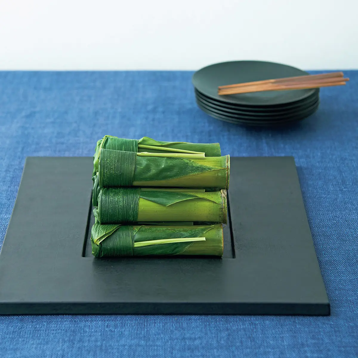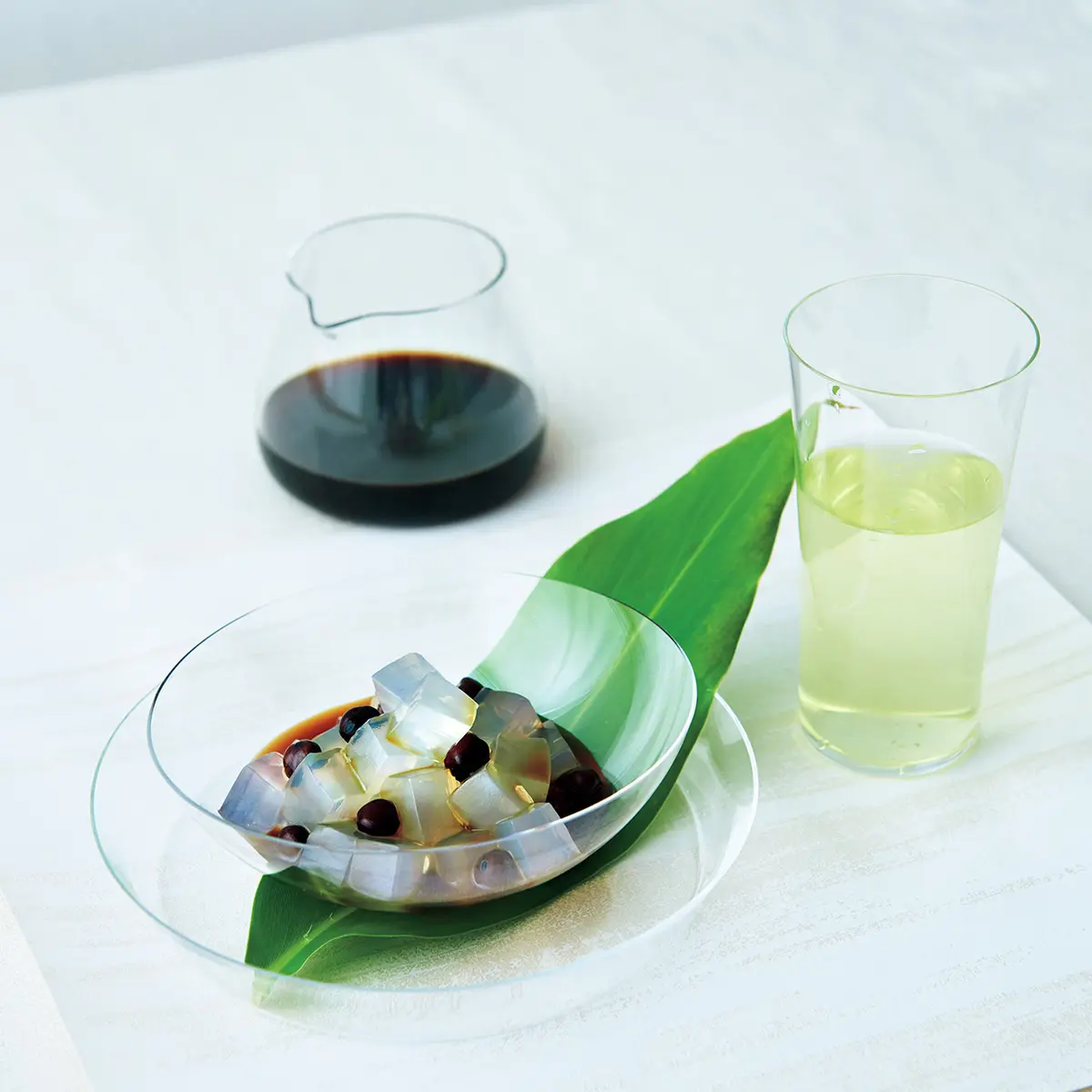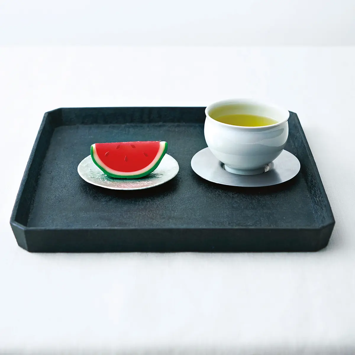 4.2色の水ようかんを組み合わせて、サプライズあずきのコクがしっかり味わえる上品な甘さの水ようかんはあずきとややあっさりめの白あずき、それぞれ粒あんとこしあんがそろう。「より口当たりの優しいこしあんの2色を選び、ほどよい大きさにカット。味の違いが楽しめるよう、並べて盛りつけました」。白磁の平皿は青みがかった色合いが美しい柏木円さん作。福森道歩さん作の湯飲みには山帰来を葉蓋に、新宮州三さん作の黒漆の隅切盆できりりと引き締めて。